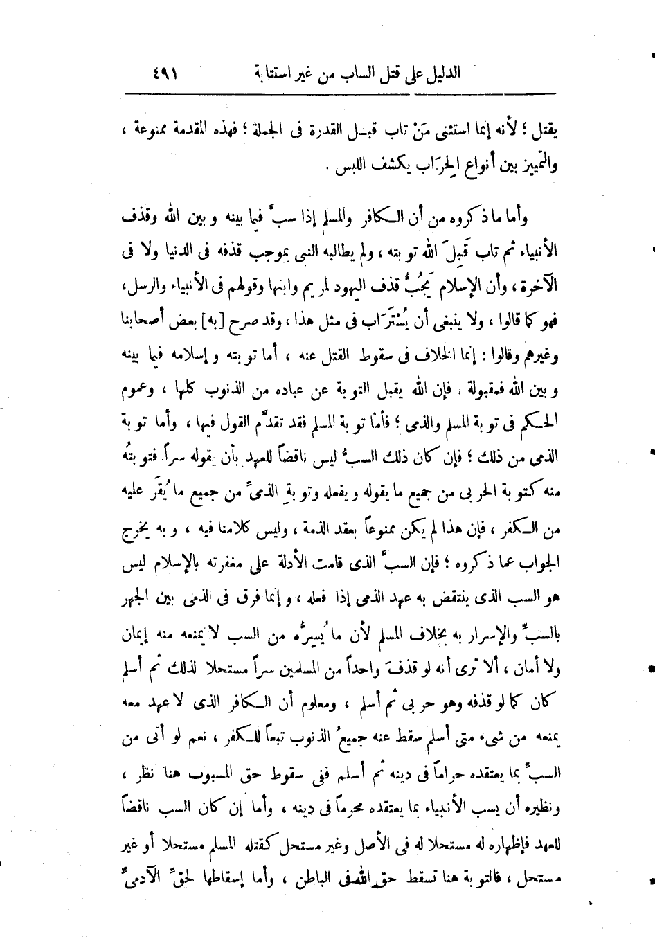 وأما ما ذكروه من أن الكافر أو المسلم إذا سب فيما بينه وبين الله وقذف الأنبياء ثم تاب قبل الله توبته ولم يطالبه النبي بموجب قذفه في الدنيا ولا في الآخرة وأن الإسلام يجب قذف اليهود لمريم وابنها وقولهم في الأنبياء والرسل فهو كما قالوا ولا ينبغي أن يستراب في مثل هذا وقد صرح به بعض أصحابنا وغيرهم وقالوا: إنما الخلاف في سقوط القتل عنه أما توبته وإسلامه فيما بينه وبين الله فمقبولة فإن الله يقبل التوبة عن عباده من الذنوب كلها وعموم الحكم في توبة المسلم والذمي فأما توبة المسلم فقد تقدم القول فيها وأما توبة الذي من ذلك فإن كان ذلك السب ليس ناقضا للعهد بأن يقوله سرا فتوبته منه كتوبة الحربي من جميع ما يقوله ويفعله وتوبة الذمي من جميع ما يقر عليه من الكفر فإن هذا لم يكن ممنوعا منه بعقد الذمة وليس كلامنا فيه وبه يخرج الجواب عما ذكروه فإن السب الذي قامت الأدلة على مغفرته بالإسلام ليس هو السب الذي ينتقض به عهد الذمي إذا فعله وإنما فرق في الذمي بين الجهر بالسب والإسرار به بخلاف المسلم لأن ما يسره من السب لا يمنعه منه إيمان ولا أمان ألا ترى أنه لو قذف واحدا من المسلمين سرا مستحلا لذلك ثم أسلم كما لو قذفه وهو حربي ثم أسلم ومعلوم أن الكافر الذي لا عهد معه يمنعه من شيء متى أسلم سقط عنه جميع الذنوب تبعا للكفر نعم لو أتى من السب بما يعتقده حراما في دينه ثم أسلم ففي سقوط حق المسبوب هنا نظر ونظيره أن يسب الأنبياء بما يعتقده محرما في دينه وأما إن كان السب ناقضا للعهد فإظهاره له مستحلا له في الأصل وغير مستحل كقتله المسلم مستحلا أو غير مستحل فالتوبة هنا تسقط حق الله في الباطن وأما إسقاطها لحق الآدمي