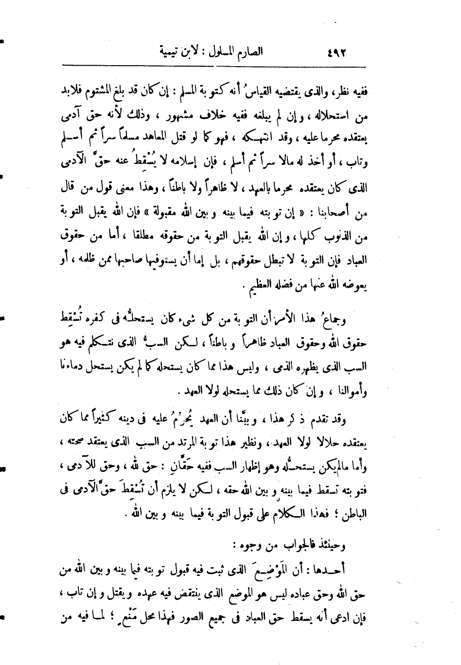 وقد تقدم ذكر هذا وبينا أن العهد يحرم عليه في دينه كثيرا مما كان يعتقده حلالا لولا العهد ونظير هذا توبة المرتد من السب الذي يعتقد صحته وأما ما لم يكن يستحله وهو إظهار السب ففيه حقان: حق الله وحق للآدمي فتوبته تسقط فيما بينه وبين الله حقه لكن لا يلزم أن تسقط حق الآدمي في الباطن فهذا الكلام على قبول التوبة فيما بينه وبين الله.