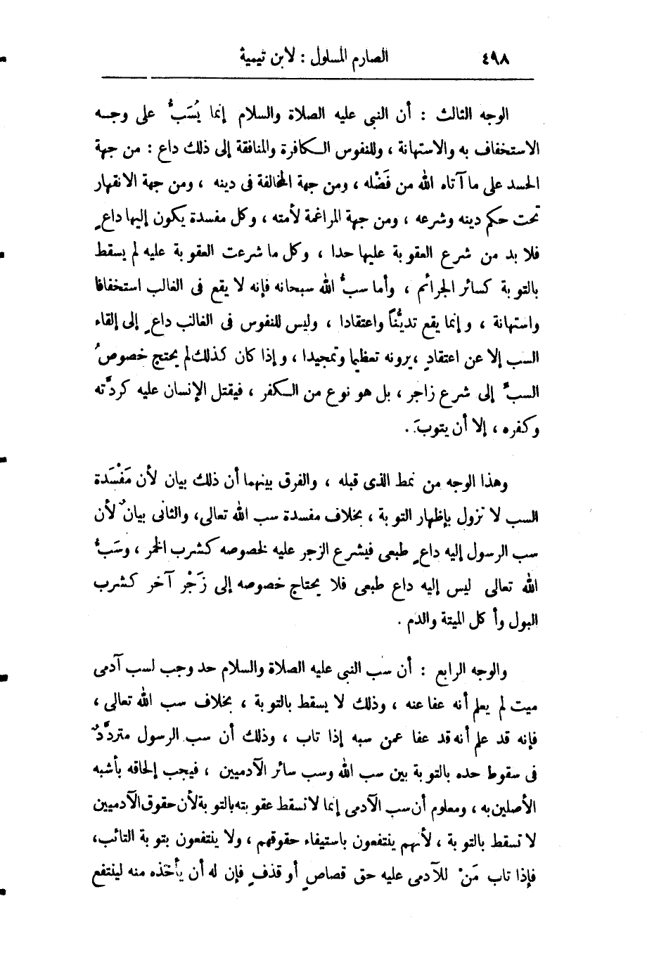 الوجه الثالث: أن عليه الصلاة والسلام إنما يسب على وجه الاستخفاف به والاستهانة وللنفوس الكافرة والمنافقة إلى ذلك داع: من جهة الحسد على ما آتاه الله من فضله ومن جهة المخالفة في دينه ومن جهة الانقهار تحت حكم دينه وشرعه ومن جهة المراغمة لأمته وكل مفسدة يكون إليها داع فلا بد من شرع العقوبة عليها حدا وكل ما شرعت العقوبة عليه لم يسقط بالتوبة كسائر الجرائم وأما سب الله سبحانه فإنه لا يقع في الغالب استخفافا واستهانة وإنما يقع تدينا واعتقادا وليس للنفوس في الغالب داع إلى إلقاء السب إلا عن اعتقاد يرونه تعظيما وتمجيدا وإذا كان كذلك لم يحتج خصوص السب إلى شرع زاجر بل هو نوع من الكفر فيقتل الإنسان عليه كردته وكفره إلا أن يتوب.