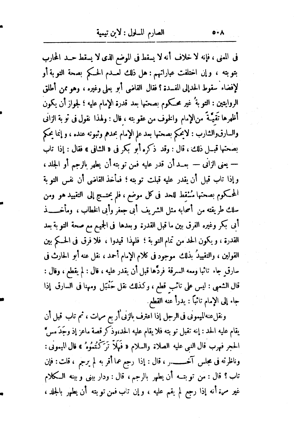 في المعنى فإنه لا خلاف أنه لا يسقط في الموضع الذي لا يسقط حد المحارب بتوبته وإن اختلفت عباراتهم: هل ذلك لعدم الحكم بصحة التوبة أو لإفضاء سقوط الحد إلى المفسدة؟ فقال القاضي أبو يعلى وغيره وهو ممن أطلق الروايتين: التوبة غير محكوم بصحتها بعد قدرة الإمام عليه لجواز أن يكون أظهرها تقية من الإمام والخوف من عقوبته قال: ولهذا نقول في توبة الزاني والسارق والشارب: لا يحكم بصحتها بعد علم الإمام بحدهم وثبوته عنده وإنما يحكم بصحتها قبل ذلك قال: وقد ذكره أبو بكر في "الشافي" فقال: "إذا تاب يعني الزاني بعد أن قدر عليه فمن توبته أن يطهر بالرجم أو الجلد وإذا تاب قبل أن يقدر عليه قبلت توبته" فمأخذ القاضي أن نفس التوبة المحكوم بصحتها مسقطة للحد في كل موضع فلم يحتج إلى التقييد هو ومن سلك طريقته من أصحابه مثل الشريف أبي جعفر وأبي الخطاب ومأخذ أبي بكر وغيره الفرق بين ما قبل القدرة وبعدها في الجميع مع صحة التوبة بعد القدرة ويكون الحد من تمام التوبة فلهذا قيدوا فلا فرق في الحكم بين القولين والتقييد بذلك موجود في كلام الإمام أحمد نقل عنه أبو الحارث في سارق جاء تائبا ومعه السرقة فردها قبل أن يقدر عليه قال: "لم يقطع" وقال: قال الشعبي: "ليس على تائب قطع" وكذلك نقل حنبل ومهنا في السارق إذا جاء إلى الإمام تائبا: "يدرأ عنه القطع".