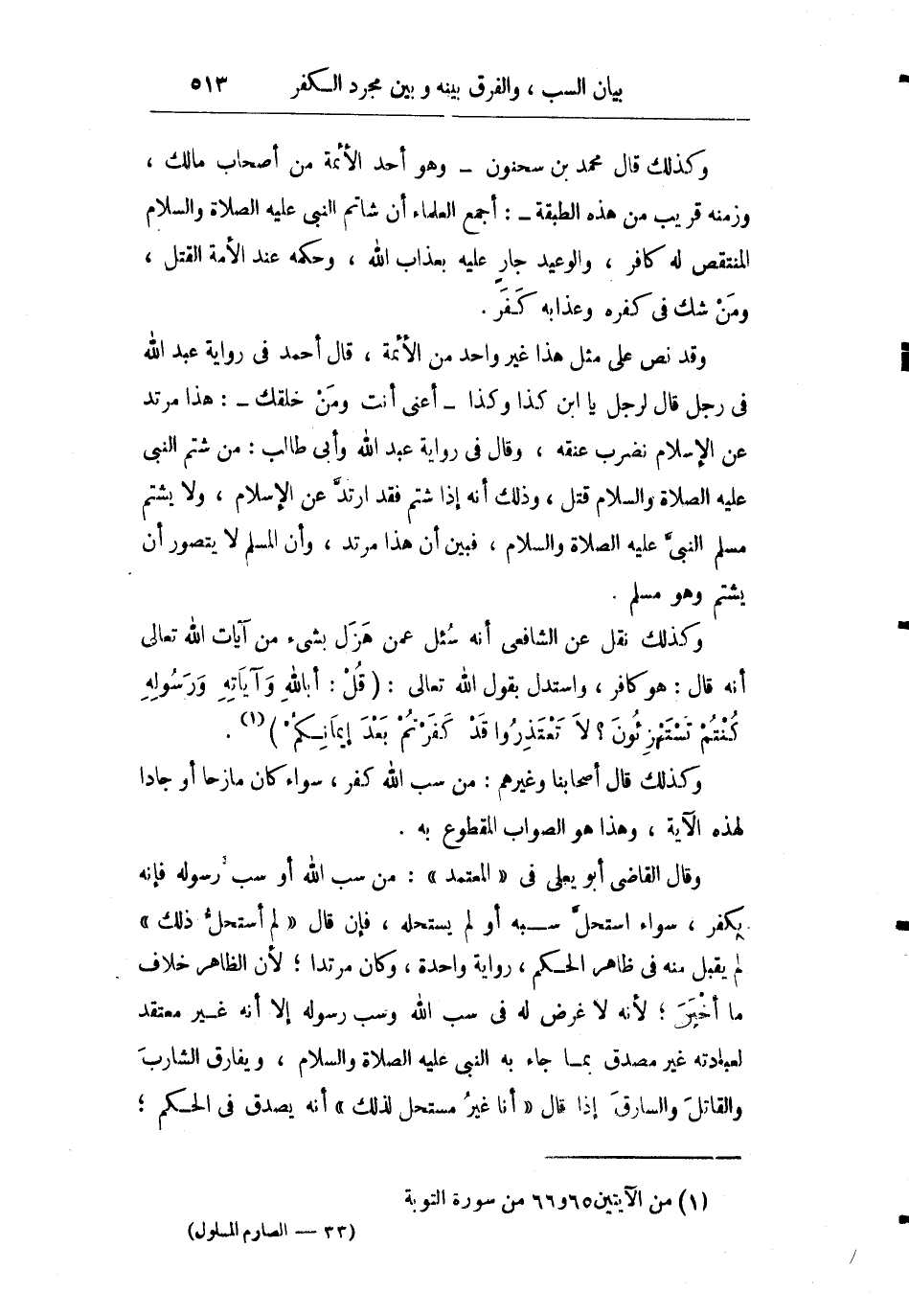 وكذلك قال محمد بن سحنون وهو أحد الأئمة من أصحاب مالك وزمنه قريب من هذه الطبقة: "أجمع العلماء أن شاتم النبي صلى الله عليه وسلم المنتقص له كافر والوعيد جار عليه بعذاب الله وحكمه عند الأمة القتل ومن شك في كفره وعذابه كفر".