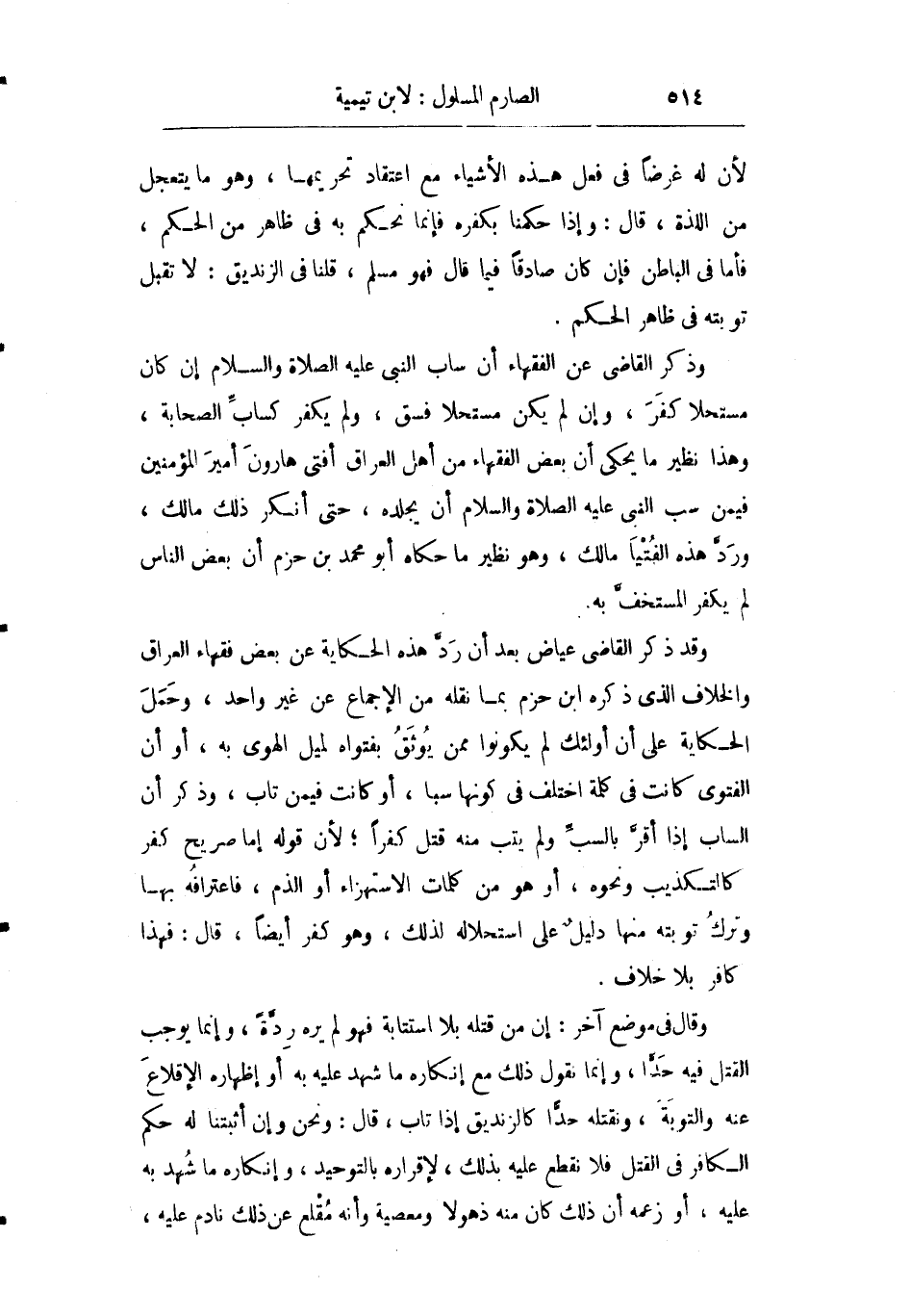 وذكر القاضي عن الفقهاء أن ساب النبي صلى الله عليه وسلم إن كان مستحلا كفر وإن لم يكن مستحلا فسق ولم يكفر كساب الصحابة وهذا نظير ما يحكى أن بعض الفقهاء من أهل العراق أفتى هارون أمير المؤمنين فيمن سب النبي صلى الله عليه وسلم أن يجلده حتى أنكر ذلك مالك ورد هذه الفتيا مالك وهو نظير ما حكاه أبو محمد ابن حزم أن بعض الناس لم يكفر المستخف به.