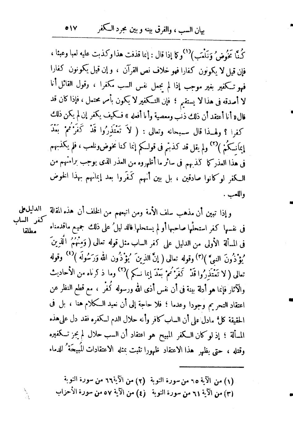 كُنَّا نَخُوضُ وَنَلْعَب} كما إذا قال: إنما قذفت هذا أو كذبت عليه لعبا وعبثا فإن قيل لا يكونون كفارا فهو خلاف نص القرآن وإن قيل يكونون كفارا فهو تكفير بغير موجب إذا لم يجعل نفس السب مكفرا وقول القائل أنا لا أصدقه في هذا لا يستقيم فإن التكفير لا يكون بأمر محتمل فإذا كان قد قال: "أنا أعتقد أن ذلك ذنب ومعصية وأنا أفعله" فكيف يكفر إن لم يكن ذلك كفرا؟ ولهذا قال سبحانه وتعالى: {لا تَعْتَذِرُوا قَدْ كَفَرْتُمْ بَعْدَ إِيمَانِكُمْ} ولم يقل قد كذبتم في قولكم إنما كنا نخوض ونلعب فلم يكذبهم في هذا العذر كما كذبهم في سائر ما أظهروه من العذر الذي يوجب براءتهم من الكفر كما لو كانوا صادقين بل بين أنهم كفروا بعد إيمانهم بهذا الخوض واللعب.