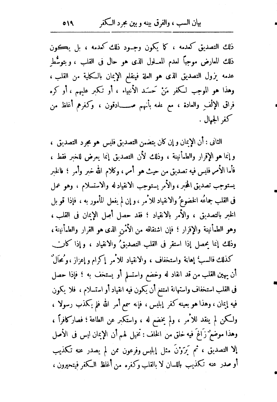 ذلك التصديق كعدمه كما يكون وجود ذلك كعدمه بل يكون ذلك المعارض موجبا لعدم المعلول الذي هو حال في القلب وبتوسط عدمه يزول التصديق الذي هو العلة فينقلع الإيمان بالكلية من القلب وهذا هو الموجب لكفر من حسد الأنبياء أو تكبر عليهم أو كره فراق الإلف والعادة مع علمه بأنهم صادقون وكفرهم أغلظ من كفر الجهال.