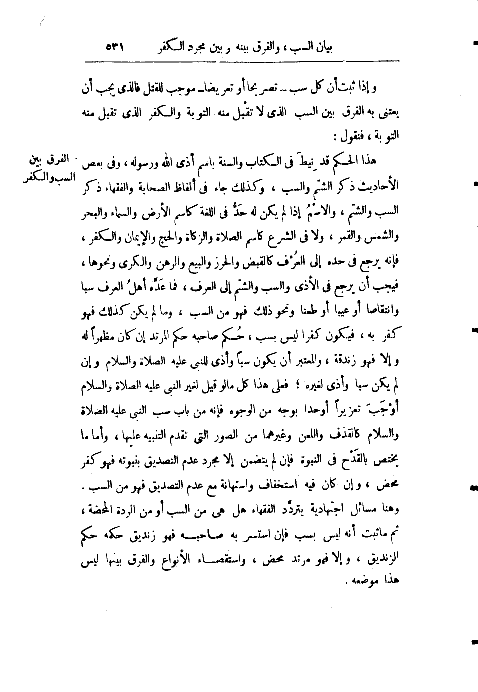 هذا الحكم قد نيط في الكتاب والسنة باسم أذى الله ورسوله وفي بعض الأحاديث ذكر الشتم والسب وكذلك جاء في ألفاظ الصحابة والفقهاء ذكر السب والشتم والاسم إذا لم يكن له حد في اللغة كاسم الأرض والسماء والبر والبحر والشمس والقمر ولا في الشرع كاسم الصلاة والزكاة والحج والإيمان والكفر فإنه يرجع في حده إلى العرف كالقبض والحرز والبيع والرهن والكرى ونحوها فيجب أن يرجع في الأذى والشتم إلى العرف فما عده أهل العرف سبا أو انتقاصا أو عيبا أو طعنا ونحو ذلك فهو من السب وما لم يكن كذلك فهو كفر به فيكون كفرا ليس بسب حكم صاحبه حكم المرتد إن كان مظهرا له وإلا فهو زندقة والمعتبر أن يكون سبا وأذى للنبي عليه الصلاة والسلام وإن لم يكن سبا وأذى لغيره فعلى هذا كل ما لو قيل لغير النبي صلى الله عليه وسلم أوجب تعزيرا أو حدا بوجه من الوجوه فإنه من باب سب النبي صلى الله عليه وسلم كالقذف واللعن وغيرهما من الصورة التي تقدم التنبيه عليها وأما ما يختص بالقدح في النبوة فإن لم يتضمن إلا مجرد عدم التصديق بنبوته فهو كفر محض وإن كان فيه استخفاف واستهانة مع عدم التصديق فهو من السب وهنا مسائل اجتهادية يتردد الفقهاء هل هي من السب أو من الردة المحضة ثم ما ثبت أنه ليس بسب فإن استسر به صاحبه فهو زنديق حكمه حكم الزندقة وإلا فهو مرتد محض واستقصاء الأنواع والفرق بينها ليس هذا موضعه.