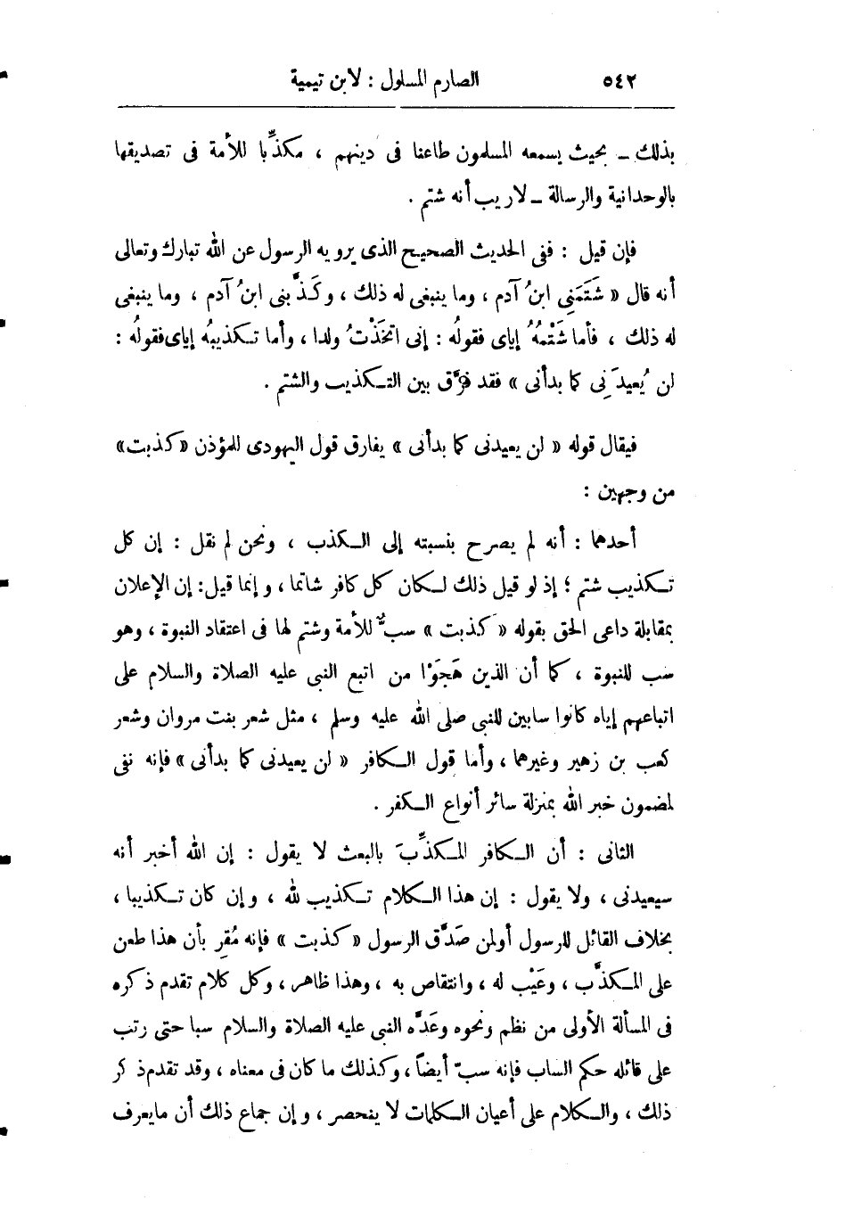 أحدهما: أنه لم يصرح بنسبته إلى الكذب ونحن لم نقل: إن كل تكذيب شتم إذ لو قيل ذلك لكان كل كافر شاتما وإنما قيل: إن الإعلان بمقابلة داعي الحق بقوله: "كذبت" سب للأمة وشتم لها في اعتقاد النبوة وهو سب للنبوة كما أن الذين هجوا من اتبع النبي صلى الله عليه وسلم على إتباعهم إياه كانوا سابين للنبي صلى الله عليه وسلم مثل شعر بنت مروان وشعر كعب بن زهير وغيرهما وأما قول الكافر: "لن يعيدني كما بدأني" فإنه نفي لمضمون خبر الله بمنزلة سائر أنواع الكفر.