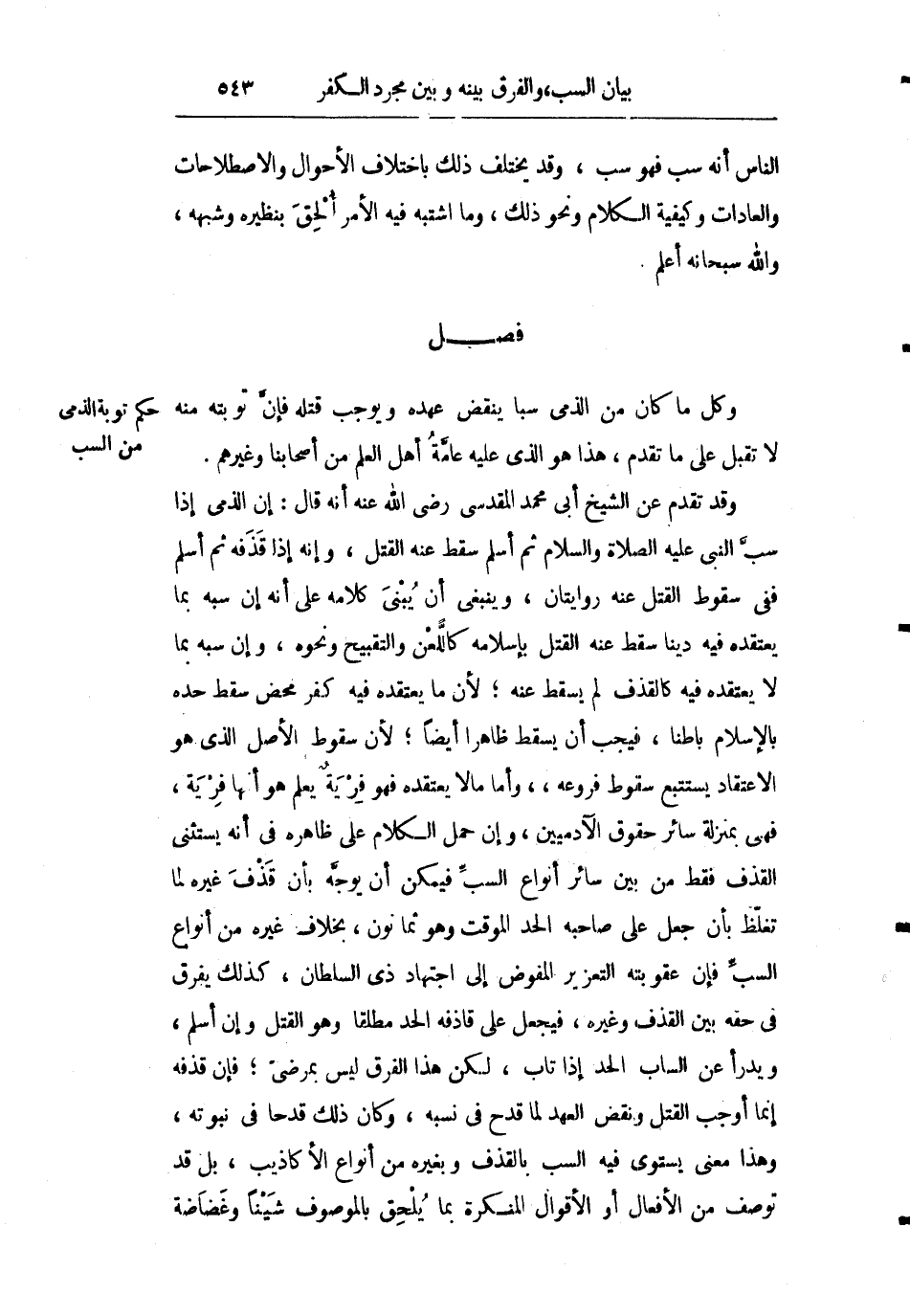 وقد تقدم عن الشيخ أبي محمد المقدسي رضي الله عنه أنه قال: إن الذمي إذا سب النبي صلى الله عليه وسلم ثم أسلم سقط عنه القتل وإنه إذا قذفه ثم أسلم ففي سقوط القتل عنه روايتان وينبغي أن يبنى كلامه على أنه إن سبه بما يعتقده فيه دينا سقط عنه القتل بإسلامه كاللعن والتقبيح ونحوه وإن سبه بما لا يعتقده فيه كالقذف لم يسقط عنه لأن ما يعتقده فيه كفر محض سقط حده بالإسلام باطنا فيجب أن يسقط ظاهرا أيضا لأن سقوط الأصل الذي هو الاعتقاد يستتبع سقوط فروعه وأما ما لا يعتقده فهو فرية يعلم هو أنها فرية فهي بمنزلة سائر حقوق الآدميين وإن حمل الكلام على ظاهره في أنه يستثنى القذف فقط من بين سائر أنواع السب فيمكن أن يوجه بأن قذف غيره لما تغلظ بأن جعل على صاحبه الحد المؤقت وهو ثمانون بخلاف غيره من أنواع السب فإن عقوبته التعزير المفوض إلى اجتهاد ذي السلطان كذلك يفرق في حقه بين القذف وغيره فيجعل على قاذفه الحد مطلقا وهو القتل وإن أسلم ويدرأ عن الساب الحد إذا تاب لكن هذا الفرق ليس بمرضي فإن قذفه إنما أوجب القتل ونقض العهد لما قدح في نسبه وكان ذلك قدحا في نبوته وهذا معنى يستوي فيه السب بالقذف وبغيره من أنواع الأكاذيب بل قد توصف من الأفعال أو الأقوال المنكرة بما يلحق بالموصوف شيئا وغضاضة