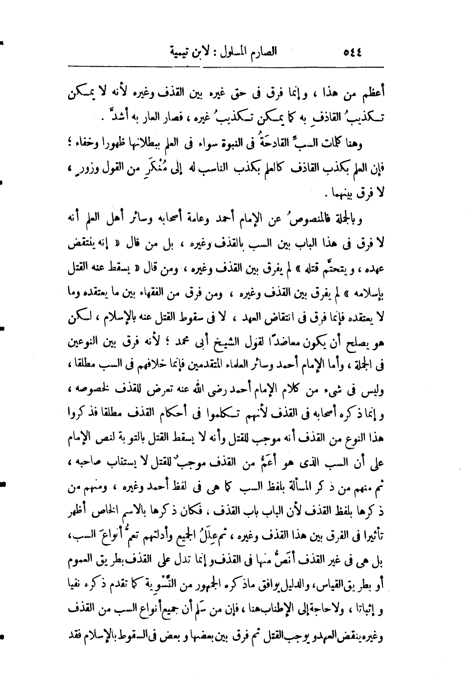 وبالجملة فالمنصوص عن الإمام أحمد وعامة أصحابه وسائر أهل العلم أنه لا فرق في هذا الباب بين السب بالقذف وغيره بل من قال: "إنه ينتقض عهده ويتحتم قتله" لم يفرق بين القذف وغيره ومن قال: "يسقط عنه القتل بإسلامه" لم يفرق بين القذف وغيره ومن فرق من الفقهاء بين ما يعتقده وما لا يعتقده فإنما فرق في انتقاض العهد لا في سقوط القتل عنه بالإسلام لكن هو يصلح أن يكون معاضدا لقول الشيخ أبي محمد لأنه فرق بين النوعين في الجملة وأما الإمام أحمد وسائر العلماء المتقدمين فإنما خلافهم في السب مطلقا وليس في شيء من كلام الإمام أحمد رضي الله عنه تعرض للقذف لخصوصه وإنما ذكره أصحابه في القذف لأنهم تكلموا في أحكام القذف مطلقا فذكروا هذا النوع من القذف أنه موجب للقتل وأنه لا يسقط القتل بالتوبة لنص الإمام على أن السب الذي هو أعم من القذف موجب للقتل لا يستتاب صاحبه ثم منهم من ذكر المسألة بلفظ السب كما هي في لفظ أحمد وغيره ومنهم من ذكرها بلفظ القذف لأن الباب باب القذف فكان ذكرها بالاسم الخاص أظهر تأثيرا في الفرق بين هذا القذف وغيره ثم علل الجميع وأدلتهم تعم أنواع السب بل هي في غير القذف أنص منها في القذف وإنما تدل على القذف بطريق العموم أو بطريق القياس والدليل يوافق ما ذكره الجمهور من التسوية كما تقدم ذكره نفيا وإثباتا ولا حاجة إلى الإطناب هنا فإن من سلم أن جميع أنواع السب من القذف وغيره ينقض العهد ويوجب القتل ثم فرق بين بعضهما وبعض في السقوط بالإسلام فقد