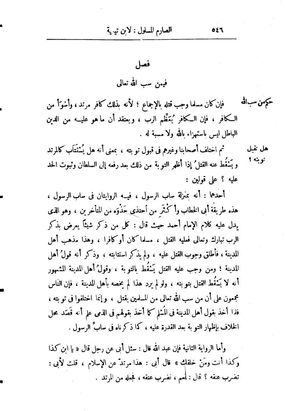أحدهما: أنه بمنزلة ساب الرسول فيه الروايتان في ساب الرسول هذه طريقة أبي الخطاب وأكثر من احتذى حذوه من المتأخرين وهو الذي يدل عليه كلام الإمام أحمد حيث قال: كل من ذكر شيئا يعرض بذكر الرب تبارك وتعالى فعليه القتل مسلما كان أو كافرا وهذا مذهب أهل المدينة فأطلق وجوب القتل عليه ولم يذكر استتابته وذكر أنه قول أهل المدينة ومن وجب عليه القتل يسقط بالتوبة وقول أهل المدينة المشهور أنه لا يسقط القتل بتوبته ولو لم يرد هذا لم يخصه بأهل المدينة فإن الناس مجمعون على أن من سب الله تعالى من المسلمين يقتل وإنما اختلفوا في توبته فلما أخذ بقول أهل المدينة في المسلم كما أخذ بقولهم في الذمي علم أنه قصد محل الخلاف بإظهار التوبة بعد القدرة عليه كما ذكرناه في ساب الرسول.