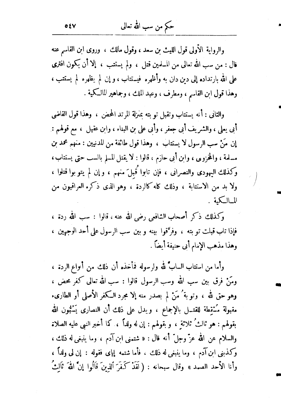 والرواية الأولى قول الليث بن سعد وقول مالك روى ابن القاسم عنه قال: "من سب الله تعالى من المسلمين قتل ولم يستتب إلا أن يكون افترى على الله بارتداده إلى دين دان به وأظهره فيستتاب وإن لم يظهره لم يستتب وهذا قول ابن القاسم ومطرف وعبد الملك وجماهير المالكية.