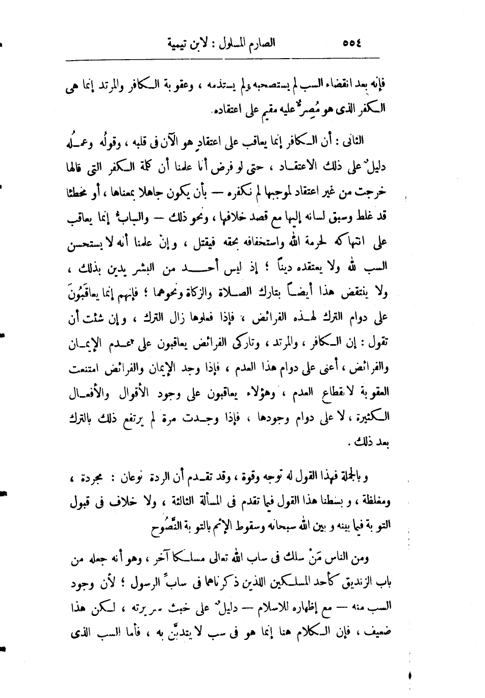 الثاني: أن الكافر إنما يعاقب على اعتقاد هو الآن في قلبه وقوله وعمله دليل على ذلك الاعتقاد حتى لو فرض أنا علمنا أن كلمة الكفر التي قالها خرجت من غير اعتقاد لموجبها لم نكفره بأن يكون جاهلا بمعناها أو مخطئا قد غلط وسبق لسانه إليها مع قصد خلافها ونحو ذلك والساب إنما يعاقب على انتهاكه لحرمة الله واستخفافه بحقه فيقتل وإن علمنا أنه لا يستحسن السب لله ولا يعتقده دينا إذ ليس أحد من البشر يدين بذلك ولا ينتقض هذا أيضا بتارك الصلاة والزكاة ونحوهما فإنهم إنما يعاقبون على دوام الترك لهذه الفرائض فإذا فعلوها زال الترك وإن شئت أن تقول: إن الكافر والمرتد وتاركي الفرائض يعاقبون على عدم فعل الإيمان والفرائض أعني على دوام هذا العدم فإذا وجد الإيمان والفرائض امتنعت العقوبة لانقطاع العدم وهؤلاء يعاقبون على وجود الأقوال والأفعال الكبيرة لا على دوام وجودها فإذا وجدت مرة لم يرتفع ذلك بالترك بعد ذلك.