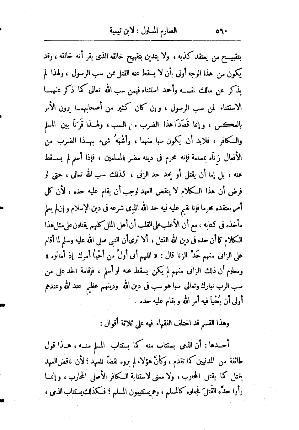 بتقبيح من يعتقد كذبه ولا يتدين بتقبيح خالقه الذي يقر أنه خالقه وقد يكون من هذا الوجه أولى بأن لا يسقط عنه القتل ممن سب الرسول ولهذا لم يذكر عن مالك نفسه وأحمد استثناء فيمن سب الله تعالى كما ذكر عنهما الاستثناء لمن سب الرسول وإن كان كثير من أصحابهما يرون الأمر بالعكس وإنما قصدا هذا الضرب من السب ولهذا قرنا بين المسلم والكافر فلا بد أن يكون سبا منهما وأشبه شيء بهذا الضرب من الأفعال زناه بمسلمة فإنه محرم في دينه مضر بالمسلمين فإذا أسلم لم يسقط عنه بل إما أن يقتل أو يحد حد الزنا كذلك سب الله تعالى حتى لو فرض أن هذا الكلام لا ينقض العهد لوجب أن يقام عليه حده لأن كل أمر يعتقده محرما فإنا نقيم عليه فيه حد الله الذي شرعه في دين الإسلام وإن لم يعلم مأخذه في كتابه مع أن الأغلب على القلب أن أهل الملل كلهم يقتلون على مثل هذا الكلام كما أن حده في دين الله القتل ألا ترى أن النبي صلى الله عليه وسلم لما أقام على الزاني منهم حد الزنا قال: "اللهم إني أول من أحيا أمرك إذ أماتوه" ومعلوم أن ذلك الزاني منهم لم يكن يسقط عنه لو أسلم فإقامة الحد على من سب الرب تبارك وتعالى سبا هو سب في دين الله ودينهم عظيم عند الله وعندهم أولى أن يحيا فيه أمر الله ويقام عليه حده.