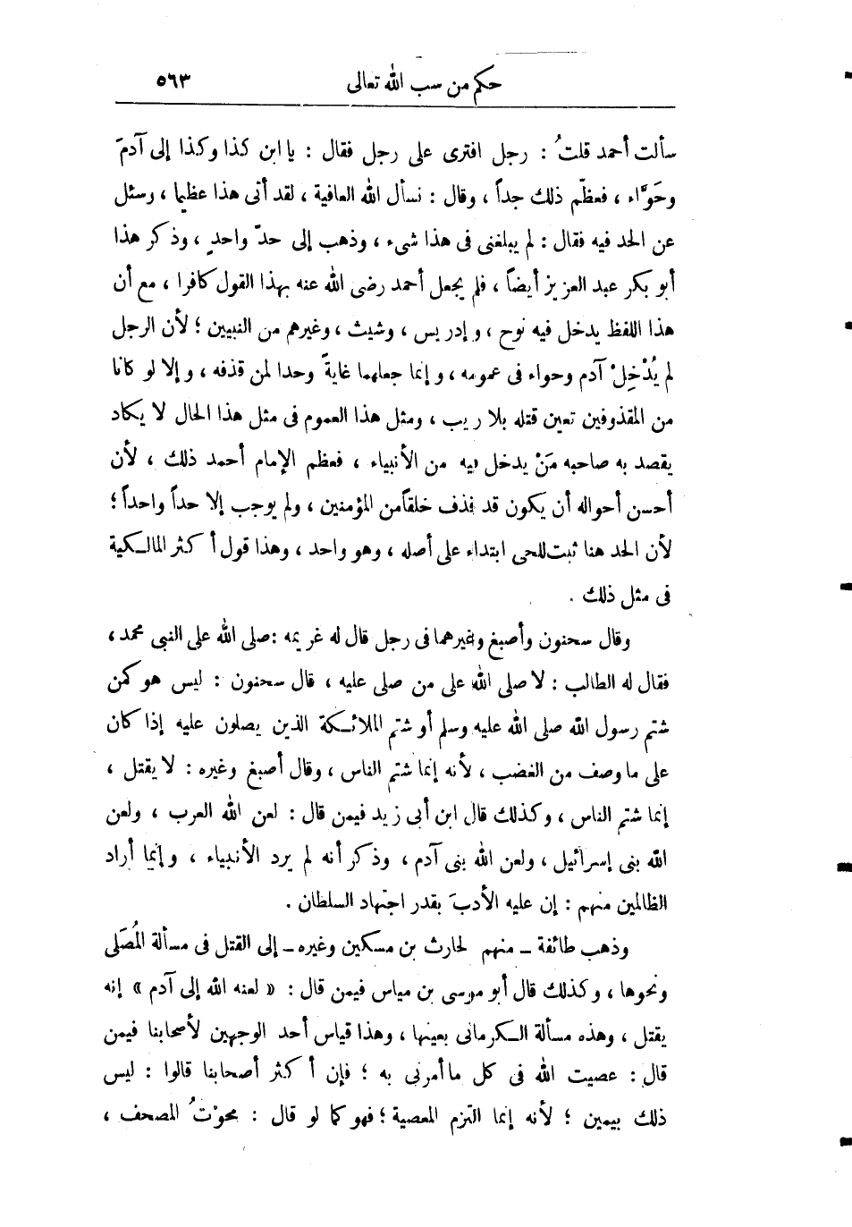 وقال سحنون وأصبغ وغيرهما في رجل قال له غريمه: صلى الله على النبي محمد فقال له الطالب: لا صلى الله على من صلى عليه قال سحنون: "ليس هو كمن شتم رسول الله صلى الله عليه وسلم أو شتم الملائكة الذين يصلون عليه إذا كان على ما وصف من الغضب لأنه إنما شتم الناس" وقال أصبغ وغيره: "لا يقتل إنما شتم الناس" وكذلك قال ابن أبي زيد فيمن قال: "لعن الله العرب ولعن الله بني إسرائيل ولعن الله بني آدم وذكر أنه لم يرد الأنبياء وإنما أردت الظالمين منهم": إن عليه الأدب بقدر اجتهاد السلطان.