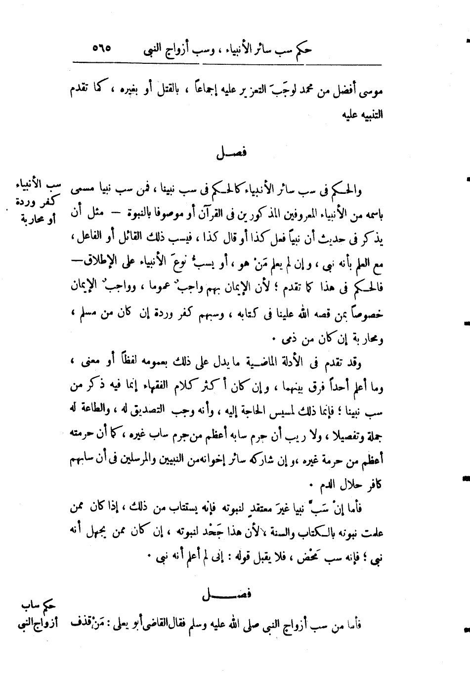 والحكم في سب سائر الأنبياء كالحكم في سب نبينا فمن سب نبيا مسمى باسمه من الأنبياء المعروفين كالمذكورين في القرآن أو موصوفا بالنبوة مثل ما يذكر حديثا أن نبيا فعل كذا أو قال كذا فيسب ذلك القائل أو الفاعل مع العلم بأنه نبي وإن لم يعلم من هو أو يسب نوع الأنبياء على الإطلاق فالحكم في هذا كما تقدم لأن الإيمان بهم واجب عموما وواجب الإيمان خصوصا بمن قصه الله علينا في كتابه وسبهم كفر وردة إن كان من مسلم ومحاربة إن كان من ذمي.