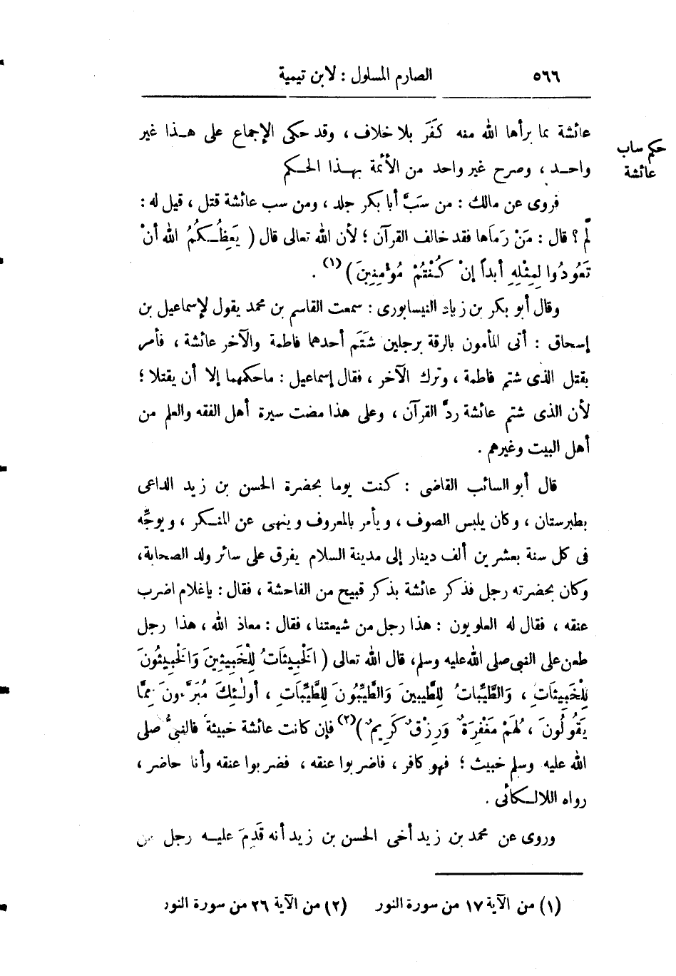 قال أبو السائب القاضي: كنت يوما بحضرة الحسن بن زيد الداعي بطبرستان وكان يلبس الصوف ويأمر بالمعروف وينهى عن المنكر ويوجه في كل سنة بعشرين ألف دينار إلى مدينة السلام يفرق على سائر ولد الصحابة وكان بحضرته رجل ذكر عائشة بذكر قبيح من الفاحشة فقال: "يا غلام اضرب عنقه" فقال له: العلويون: هذا رجل من شيعتنا فقال: "معاذ الله هذا رجل طعن على النبي صلى الله عليه وسلم قال الله تعالى: {الْخَبِيثَاتُ لِلْخَبِيثِينَ وَالْخَبِيثُونَ لِلْخَبِيثَاتِ وَالطَّيِّبَاتُ لِلطَّيِّبِينَ وَالطَّيِّبُونَ لِلطَّيِّبَاتِ أُولَئِكَ مُبَرَّأُونَ مِمَّا يَقُولُونَ لَهُمْ مَغْفِرَةٌ وَرِزْقٌ كَرِيمٌ} فإن كانت عائشة خبيثة فالنبي خبيث فهو كافر فاضربوا عنقه" فضربوا عنقه وأنا حاضر رواه اللالكائي.