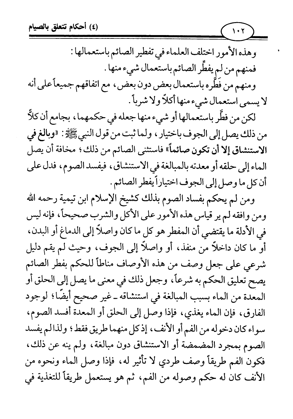 ومن لم يحكم بفساد الصوم بذلك كشيخ الإسلام ابن تيمية رحمه الله ومن وافقه لم ير قياس هذه الأمور على الأكل والشرب صحيحا، فإنه ليس في الأدلة ما يقتضي أن المفطر هو كل ما كان واصلا إلى الدماغ أو البدن، أو ما كان داخلا من منفذ، أو واصلا إلى الجوف، وحيث لم يقم دليل شرعي على جعل وصف من هذه الأوصاف مناطا للحكم بفطر الصائم يصح تعليق الحكم به شرعا. وجعل ذلك في معنى ما يصل إلى الحلق أو المعدة من الماء بسبب المبالغة في استنشاقه - غير صحيح أيضا؛ لوجود الفارق، فإن الماء يغذي، فإذا وصل إلى الحلق أو المعدة أفسد الصوم، سواء كان دخوله من الفم أو الأنف، إذ كل منهما طريق فقط؛ ولذا لم يفسد الصوم بمجرد المضمضة أو الاستنشاق دون مبالغة، ولم ينه عن ذلك، فكون الفم طريقا وصف طردي لا تأثير له، فإذا وصل الماء ونحوه من الأنف كان له حكم وصوله من الفم، ثم هو يستعمل طريقا للتغذية في