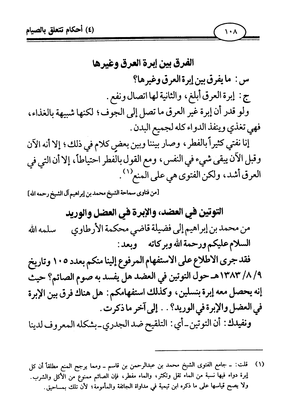 فقد جرى الاطلاع على الاستفهام المرفوع إلينا منكم بعدد 105 وتاريخ 9 8 1383 هـ حول التوتين في العضد، هل يفسد به صوم الصائم؟ حيث إنه يحصل معه إبرة بنسلين، وكذلك استفهامكم: هل هناك فرق بين الإبرة في العضل والإبرة في الوريد؟ . . إلى آخر ما ذكرت.