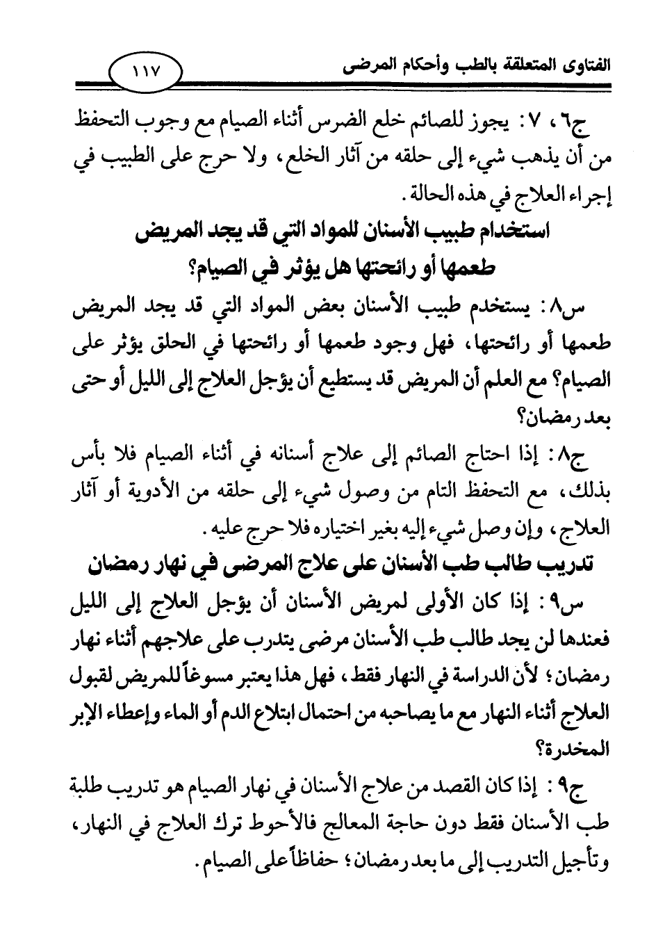 س 8: يستخدم طبيب الأسنان بعض المواد التي قد يجد المريض طعمها أو رائحتها، فهل وجود طعمها أو رائحتها في الحلق يؤثر على الصيام؟ مع العلم أن المريض قد يستطيع أن يؤجل العلاج إلى الليل أو حتى بعد رمضان؟