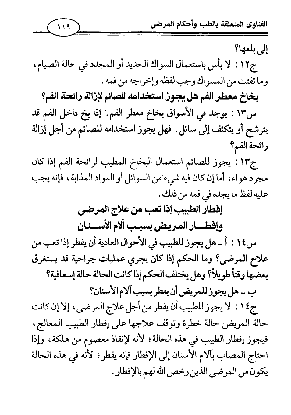 ج 14: لا يجوز للطبيب أن يفطر من أجل علاج المرضى، إلا إن كانت حالة المريض حالة خطرة وتوقف علاجها على إفطار الطبيب المعالج، فيجوز إفطار الطبيب في هذه الحالة؛ لأنه لإنقاذ معصوم من هلكة، وإذا احتاج المصاب بآلام الأسنان إلى الإفطار فإنه يفطر؛ لأنه في هذه الحالة يكون من المرضى الذين رخص الله لهم بالإفطار.