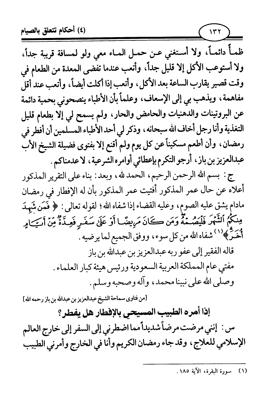 ج: بسم الله الرحمن الرحيم، الحمد لله، وبعد: بناء على التقرير المذكور أعلاه عن حال عمر المذكور أفتيت عمر المذكور بأن له الإفطار في رمضان ما دام يشق عليه الصوم وعليه القضاء إذا شفاه الله؛ لقوله تعالى: {فَمَنْ شَهِدَ مِنْكُمُ الشَّهْرَ فَلْيَصُمْهُ وَمَنْ كَانَ مَرِيضًا أَوْ عَلَى سَفَرٍ فَعِدَّةٌ مِنْ أَيَّامٍ أُخَرَ} (¬1) شفاه الله من كل سوء، ووفق الجميع لما يرضيه.