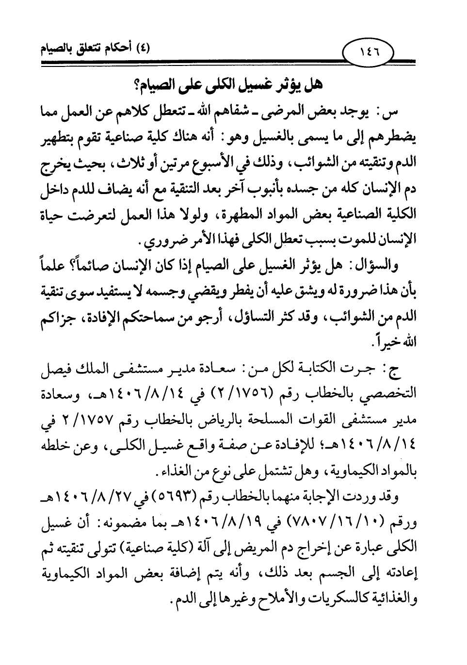 ج: جرت الكتابة لكل من: سعادة مدير مستشفى الملك فيصل التخصصي بالخطاب رقم (1756 \ 2) في 14 \ 8 \ 1406 هـ، وسعادة مدير مستشفى القوات المسلحة بالرياض بالخطاب رقم 1757 \ 2 في 4 \ 8 \ 1406 هـ؛ للإفادة عن صفة واقع غسيل الكلى، وعن خلطه بالمواد الكيماوية، وهل تشتمل على نوع من الغذاء.
