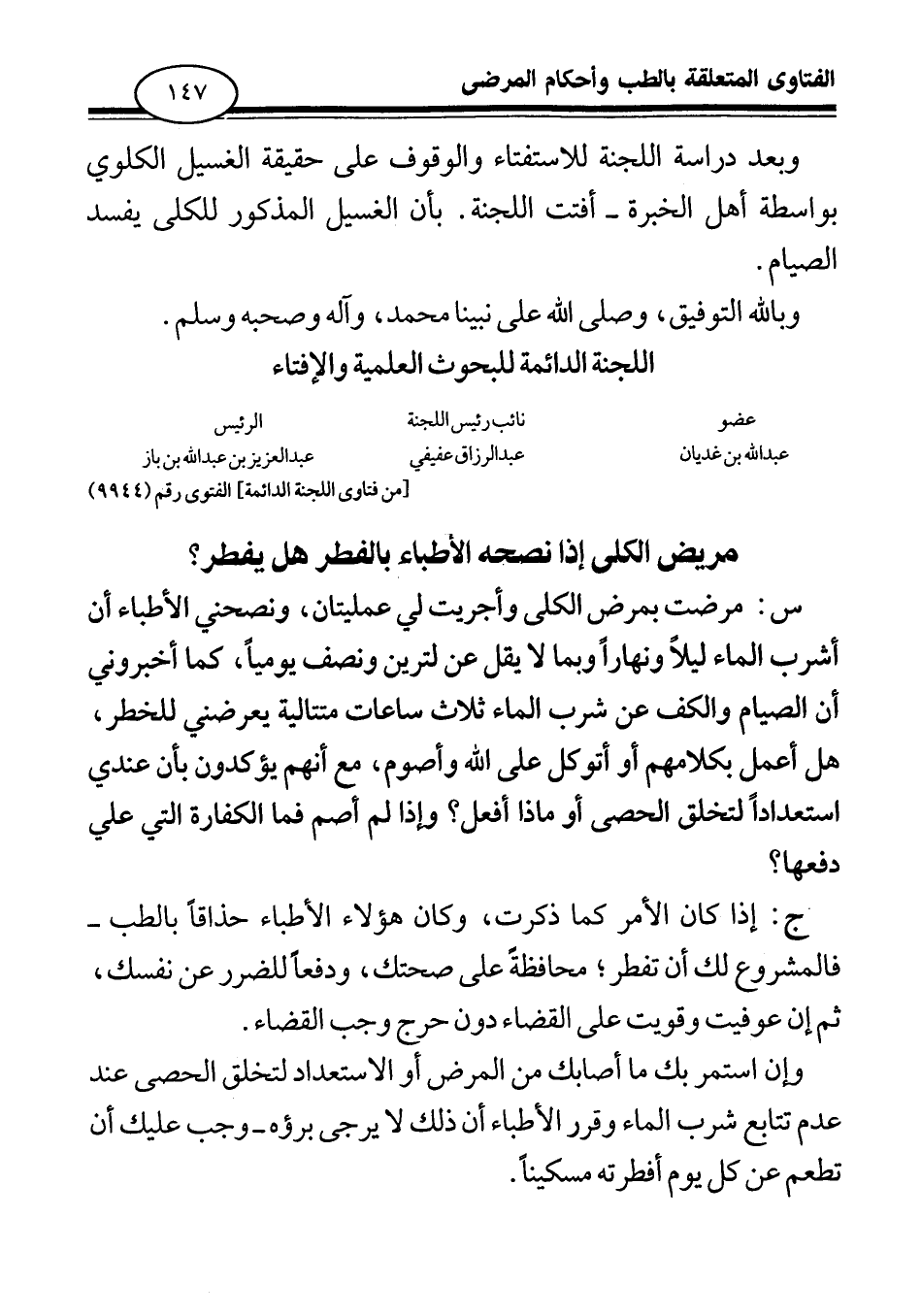وبعد دراسة اللجنة للاستفتاء والوقوف على حقيقة الغسيل الكلوي بواسطة أهل الخبرة أفتت اللجنة: بأن الغسيل المذكور للكلى يفسد الصيام.