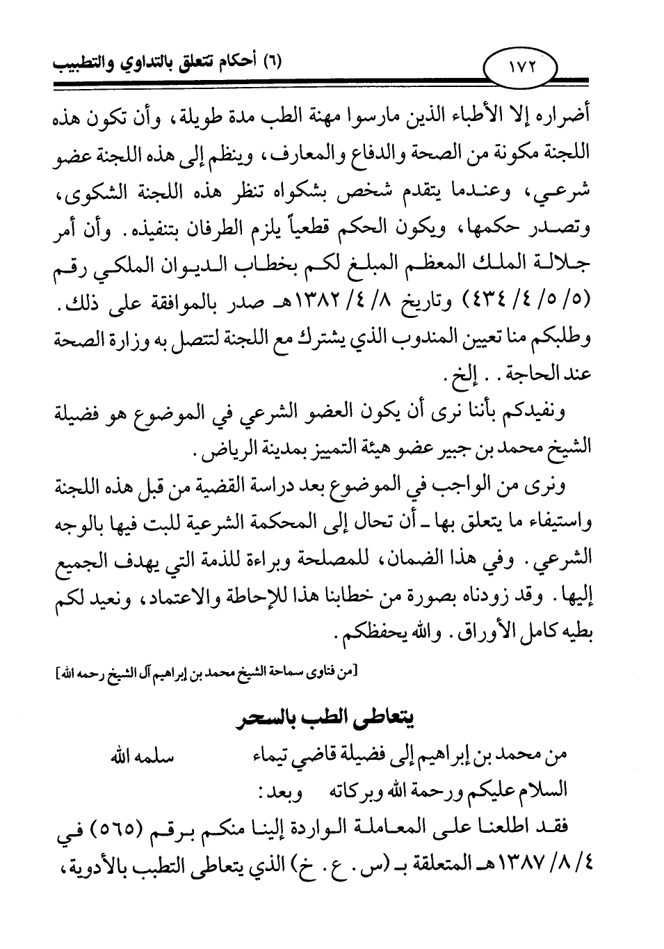 أضراره إلا الأطباء الذين مارسوا مهنة الطب مدة طويلة، وأن تكون هذه اللجنة مكونة من الصحة والدفاع والمعارف، وينظم إلى هذه اللجنة عضو شرعي، وعندما يتقدم شخص بشكواه تنظر هذه اللجنة الشكوى وتصدر حكمها، ويكون الحكم قطعيا يلزم الطرفان بتنفيذه. وأن أمر جلالة الملك المعظم المبلغ لكم بخطاب الديوان الملكي رقم (5 5 4 434) وتاريخ 8 4 1382 هـ صدر بالموافقة على ذلك. وطلبكم منا تعيين المندوب الذي يشترك مع اللجنة لتتصل به وزارة الصحة عند الحاجة. . إلخ.