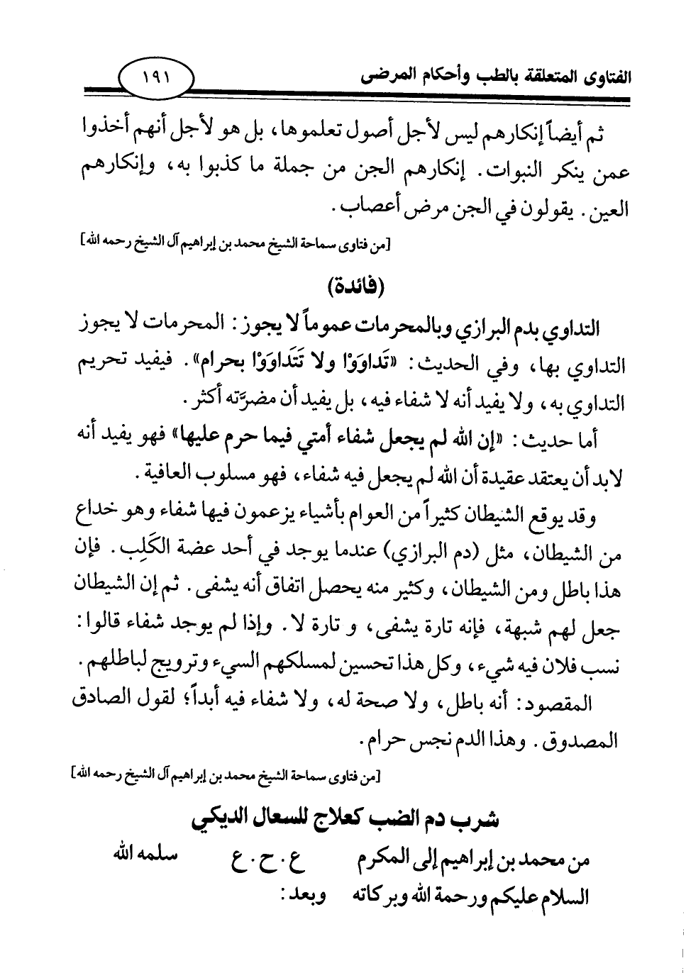 التداوي بدم البرازي وبالمحرمات عموما لا يجوز: المحرمات لا يجوز التداوي بها، وفي الحديث: «تداووا ولا تتداووا بحرام (¬1) » . فيفيد تحريم التداوي به، ولا يفيد أنه لا شفاء فيه، بل يفيد أن مضرته أكثر.