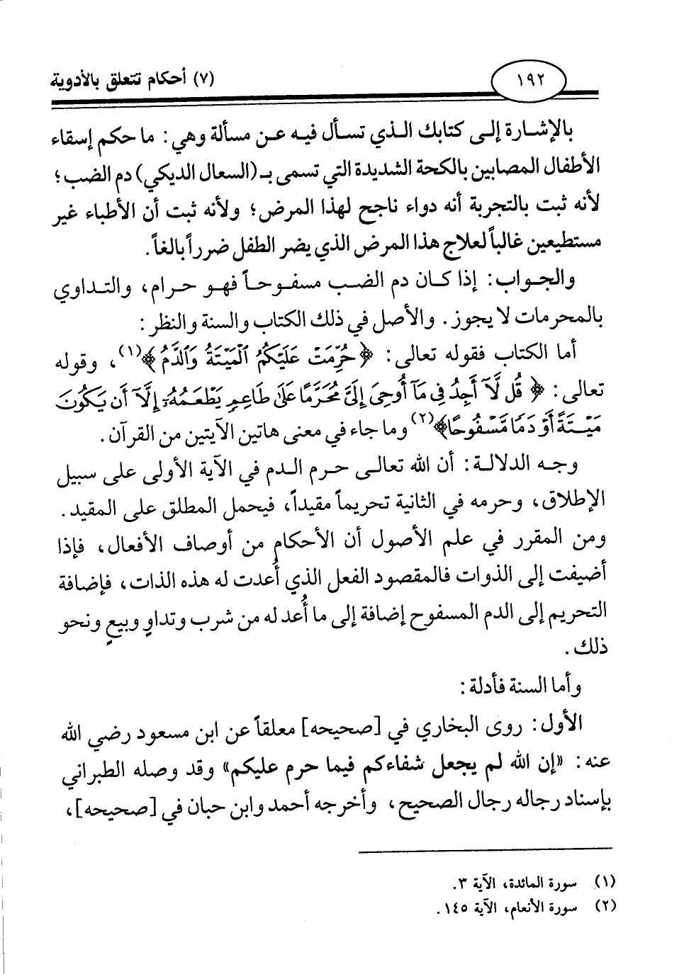 الأول: روى البخاري في [صحيحه] معلقا عن ابن مسعود رضي الله عنه: «إن الله لم يجعل شفاءكم فيما حرم عليكم» وقد وصله الطبراني بإسناد رجاله رجال الصحيح، وأخرجه أحمد وابن حبان في [صحيحه] ،
