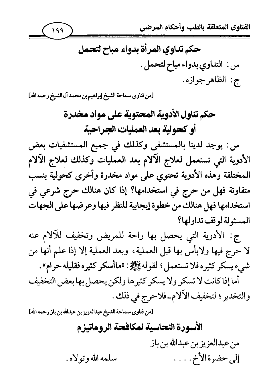 س: يوجد لدينا بالمستشفى وكذلك في جميع المستشفيات بعض الأدوية التي تستعمل لعلاج الآلام بعد العمليات وكذلك لعلاج الآلام المختلفة وهذه الأدوية تحتوي على مواد مخدرة وأخرى كحولية بنسب متفاوتة فهل من حرج في استخدامها؟ إذا كان هنالك حرج شرعي في استخدامها فهل هنالك من خطوة إيجابية للنظر فيها وعرضها على الجهات المسئولة لوقف تداولها؟