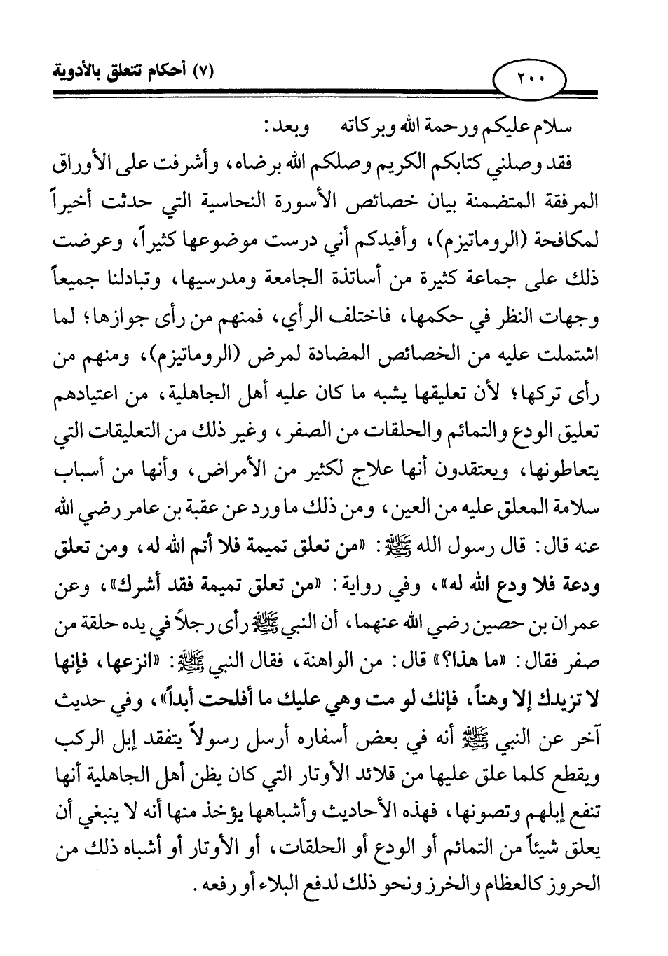 فقد وصلني كتابكم الكريم وصلكم الله برضاه، وأشرفت على الأوراق المرفقة المتضمنة بيان خصائص الأسورة النحاسية التي حدثت أخيرا لمكافحة (الروماتيزم) ، وأفيدكم أني درست موضوعها كثيرا، وعرضت ذلك على جماعة كثيرة من أساتذة الجامعة ومدرسيها، وتبادلنا جميعا وجهات النظر في حكمها، فاختلف الرأي، فمنهم من رأى جوازها؛ لما اشتملت عليه من الخصائص المضادة لمرض (الروماتيزم) ، ومنهم من رأى تركها؛ لأن تعليقها يشبه ما كان عليه أهل الجاهلية، من اعتيادهم تعليق الودع والتمائم والحلقات من الصفر، وغير ذلك من التعليقات التي يتعاطونها، ويعتقدون أنها علاج لكثير من الأمراض، وأنها من أسباب سلامة المعلق عليه من العين، ومن ذلك ما ورد عن عقبة بن عامر رضي الله عنه قال: قال رسول الله صلى الله عليه وسلم: «من تعلق تميمة فلا أتم الله له، ومن تعلق ودعة فلا ودع الله له (¬1) » وفي رواية «من تعلق تميمة فقد أشرك (¬2) » وعن عمران بن حصين رضي الله عنهما، «أن النبي صلى الله عليه وسلم رأى رجلا في يده حلقة من صفر فقال "ما هذا؟ " قال من الواهنة، فقال النبي صلى الله عليه وسلم: انزعها فإنها لا تزيدك إلا وهنا، فإنك لو مت وهي عليك ما أفلحت أبدا (¬3) » وفي حديث آخر «عن النبي صلى الله عليه وسلم أنه في بعض أسفاره أرسل رسولا يتفقد إبل الركب ويقطع كل ما علق عليها من قلائد الأوتار التي كان يظن أهل الجاهلية أنها تنفع إبلهم وتصونها» فهذه الأحاديث وأشباهها يؤخذ منها أنه لا ينبغي أن يعلق شيئا من التمائم أو الودع أو الحلقات، أو الأوتار أو أشباه ذلك من الحروز كالعظام والخرز ونحو ذلك لدفع البلاء أو رفعه.