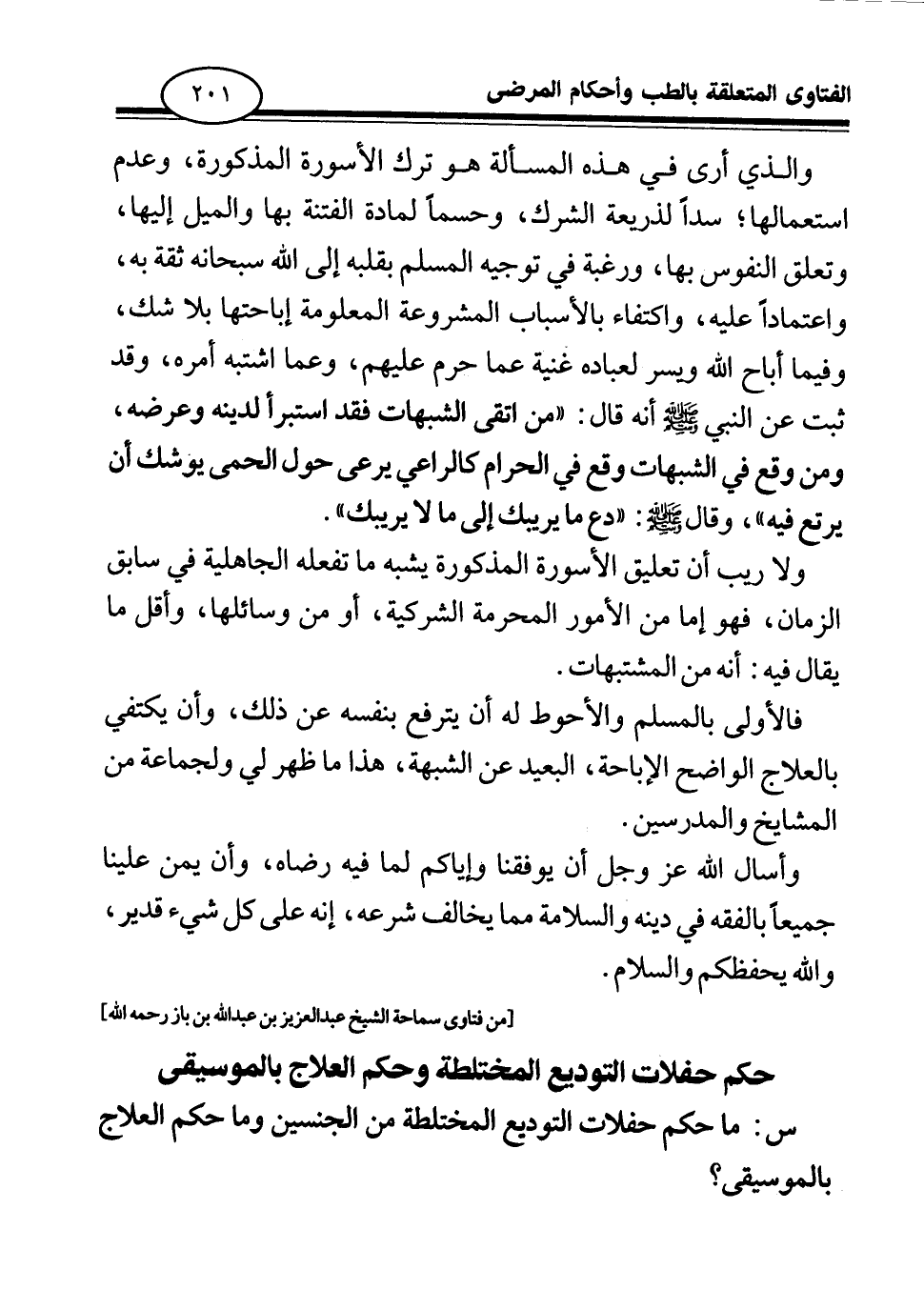 والذي أرى في هذه المسألة هو ترك الأسورة المذكورة، وعدم استعمالها سدا لذريعة الشرك، وحسما لمادة الفتنة بها والميل إليها، وتعلق النفوس بها، ورغبة في توجيه المسلم بقلبه إلى الله سبحانه ثقة به، واعتمادا عليه واكتفاء بالأسباب المشروعة المعلومة إباحتها بلا شك، وفيما أباح الله ويسر لعباده غنية عما حرم عليهم، وعما اشتبه أمره وقد ثبت عن النبي صلى الله عليه وسلم أنه قال: «من اتقى الشبهات فقد استبرأ لدينه وعرضه، ومن وقع في الشبهات وقع في الحرام كالراعي يرعى حول الحمى يوشك أن يرتع فيه (¬1) » وقال صلى الله عليه وسلم: «دع ما يريبك إلى ما لا يريبك (¬2) » .