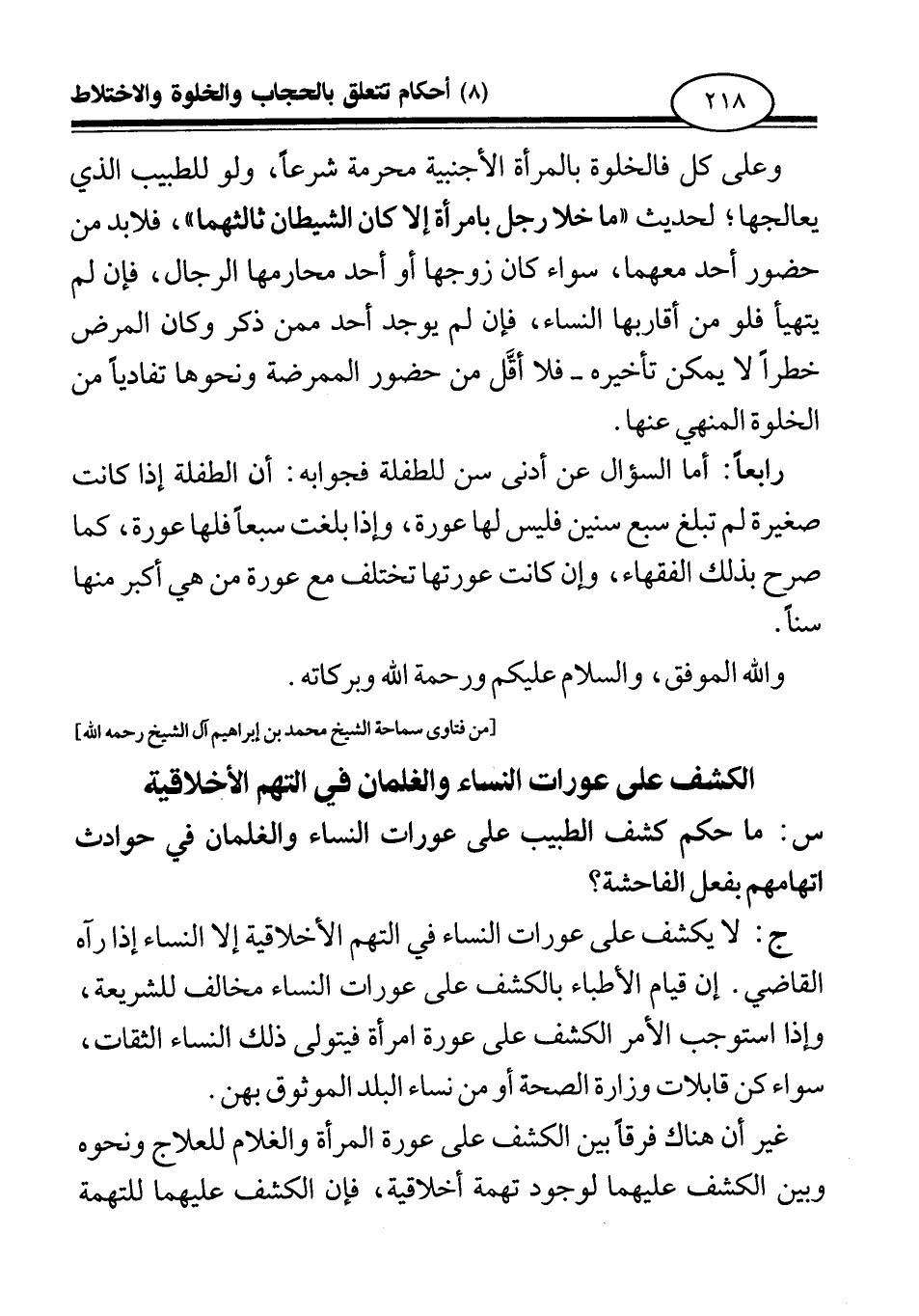 وعلى كل فالخلوة بالمرأة الأجنبية محرمة شرعا، ولو للطبيب الذي يعالجها؛ لحديث «ما خلا رجل بامرأة إلا كان الشيطان ثالثهما (¬1) » ، فلا بد من حضور أحد معهما، سواء كان زوجها أو أحد محارمها الرجال، فإن لم يتهيأ فلو من أقاربها النساء، فإن لم يوجد أحد ممن ذكر وكان المرض خطرا لا يمكن تأخيره - فلا أقل من حضور الممرضة ونحوها تفاديا من الخلوة المنهي عنها.
