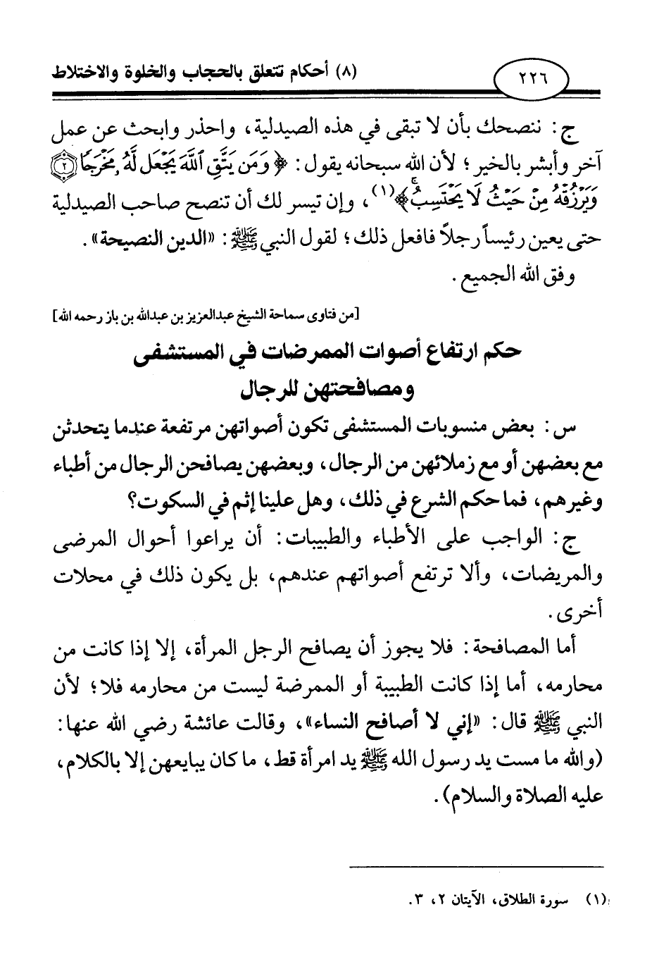 أما المصافحة فلا يجوز أن يصافح الرجل المرأة إلا إذا كانت من محارمه، أما إذا كانت الطبيبة أو الممرضة ليست من محارمه فلا؛ لأن النبي صلى الله عليه وسلم قال: «إني لا أصافح النساء (¬1) » وقالت عائشة رضي الله عنها «والله ما مست يد رسول الله صلى الله عليه وسلم يد امرأة قط، ما كان يبايعهن إلا بالكلام عليه الصلاة والسلام (¬2) » .