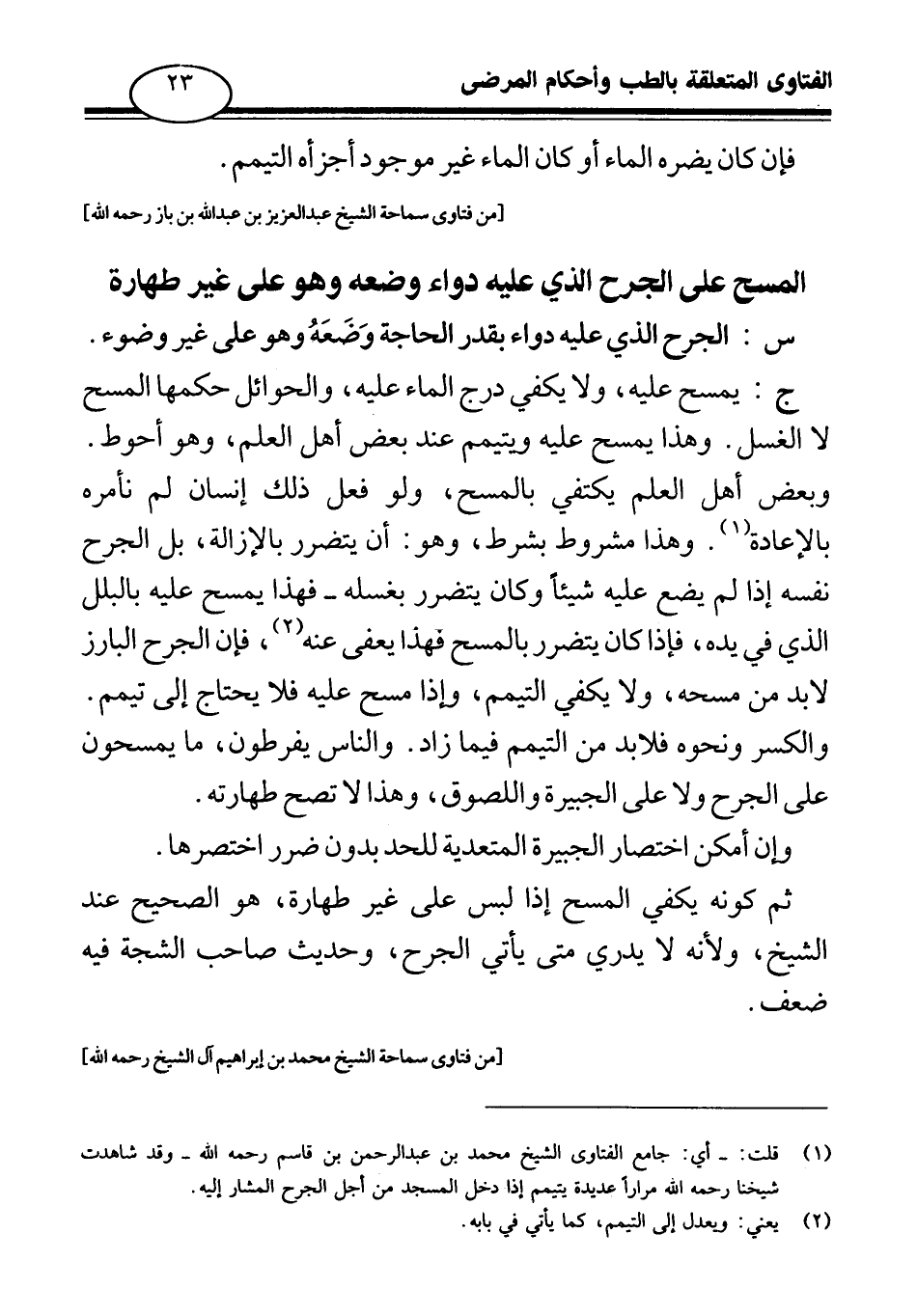 وهذا يمسح عليه ويتيمم عند بعض أهل العلم وهو أحوط. وبعض أهل العلم يكتفي بالمسح، ولو فعل ذلك إنسان لم نأمره بالإعادة. وهذا مشروط بشرط، وهو: أن يتضرر بالإزالة، بل الجرح نفسه إذا لم يضع عليه شيئا وكان يتضرر بغسله - فهذا يمسح عليه بالبلل الذي في يده، فإذا كان يتضرر بالمسح فهذا يعفى عنه (¬1) ، فإن الجرح البارز لا بد من مسحه، ولا يكفي التيمم، وإذا مسح عليه فلا يحتاج إلى تيمم. والكسر ونحوه لا بد من التيمم فيما زاد. والناس يفرطون، فما يمسحون على الجرح ولا على الجبيرة واللصوق، وبهذا لا تصح طهارتهم.
