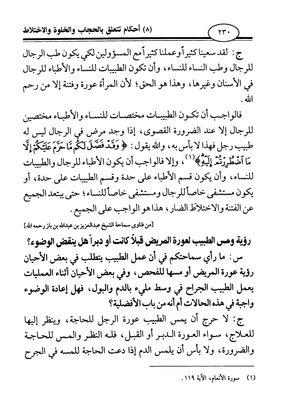 ج: لقد سعينا كثيرا وعملنا كثيرا مع المسئولين لكي يكون طب الرجال للرجال وطب النساء للنساء، وأن تكون الطبيبات للنساء والأطباء للرجال في الأسنان وغيرها، وهذا هو الحق؛ لأن المرأة عورة وفتنة إلا من رحم الله.