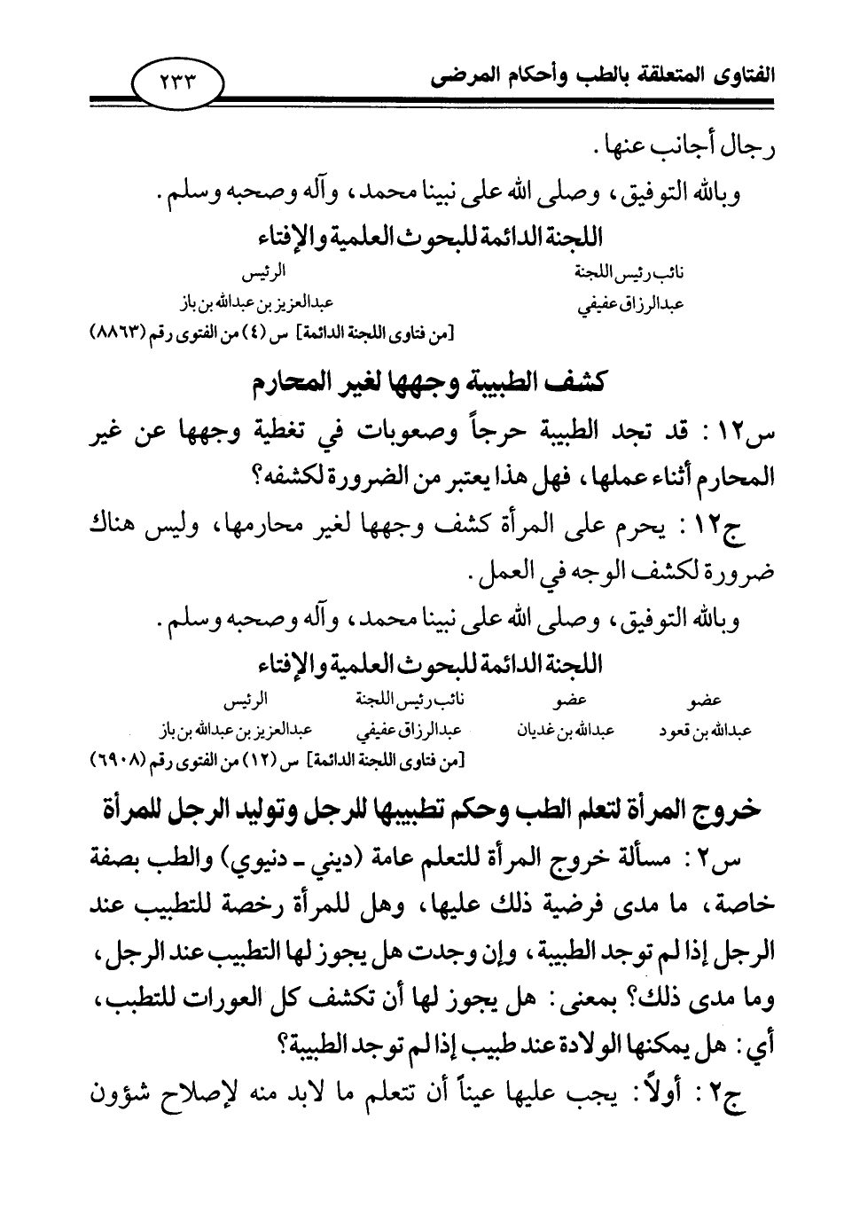 خروج المرأة لتعلم الطب وحكم تطبيبها للرجل وتوليد الرجل للمرأة
