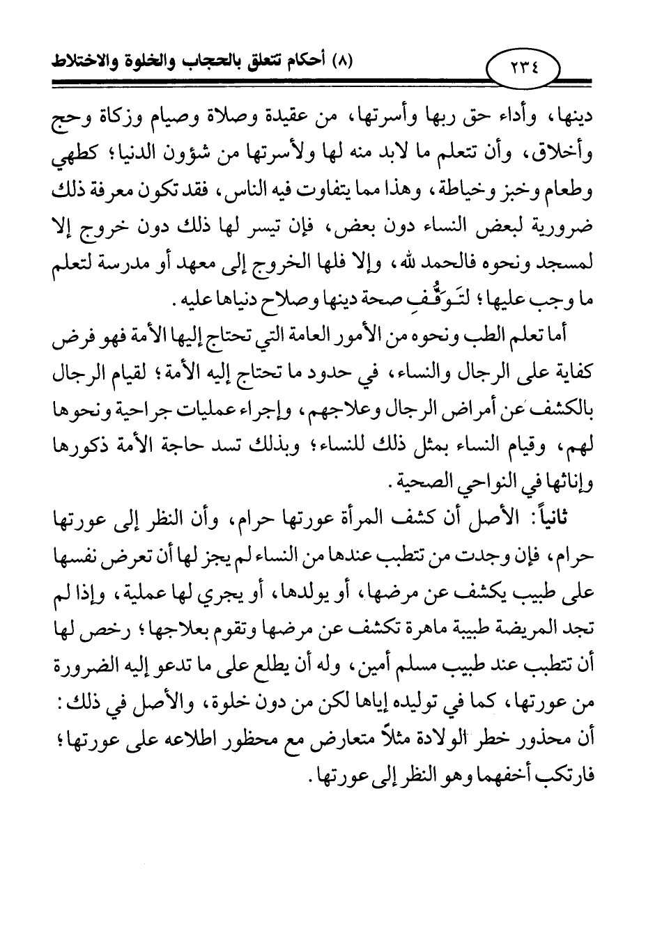 أما تعلم الطب ونحوه من الأمور العامة التي تحتاج إليها الأمة فهو فرض كفاية على الرجال والنساء، في حدود ما تحتاج إليه الأمة؛ لقيام الرجال بالكشف عن أمراض الرجال وعلاجهم، وإجراء عمليات جراحية ونحوها لهم، وقيام النساء بمثل ذلك للنساء؛ وبذلك تسد حاجة الأمة ذكورها وإناثها في النواحي الصحية.