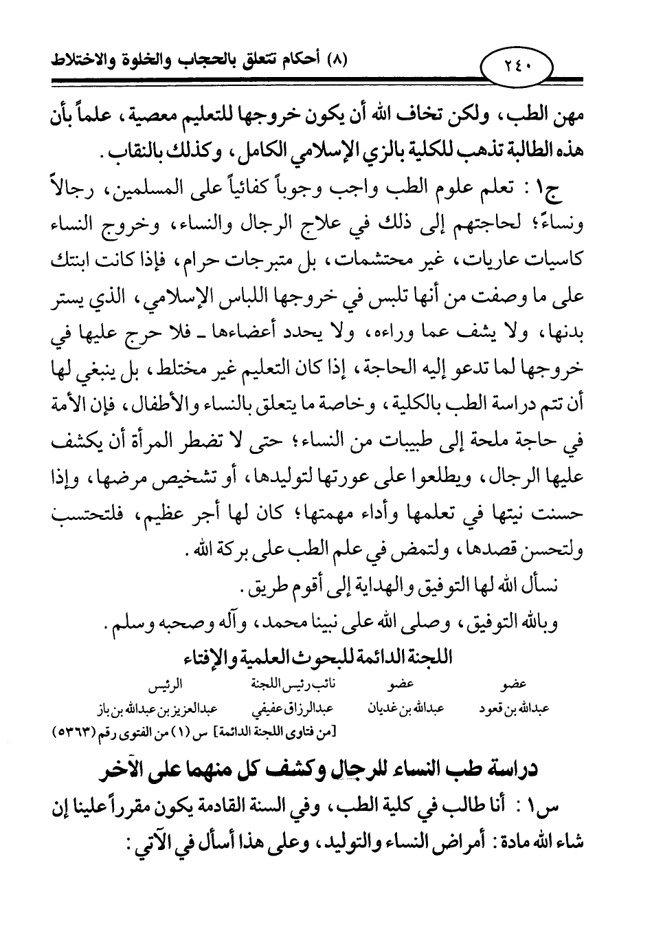 ج1: تعلم علوم الطب واجب وجوبا كفائيا على المسلمين رجالا ونساء، لحاجتهم إلى ذلك في علاج الرجال والنساء، وخروج النساء كاسيات عاريات، غير محتشمات، بل متبرجات حرام، فإذا كانت ابنتك على ما وصفت من أنها تلبس في خروجها اللباس الإسلامي، الذي يستر بدنها، ولا يشف عما وراءه، ولا يحدد أعضاءها- فلا حرج عليها في خروجها لما تدعو إليه الحاجة، إذا كان التعليم غير مختلط، بل ينبغي لها أن تتم دراسة الطب بالكلية، وخاصة ما يتعلق بالنساء والأطفال، فإن الأمة في حاجة ملحة إلى طبيبات من النساء؛ حتى لا تضطر المرأة أن يكشف عليها الرجال، ويطلعوا على عورتها لتوليدها، أو تشخيص مرضها، وإذا حسنت نيتها في تعلمها وأداء مهمتها؛ كان لها أجر عظيم، فلتحتسب ولتحسن قصدها، ولتمض في علم الطب على بركة الله.