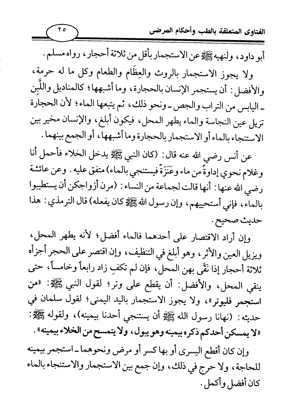 عن أنس رضي الله عنه قال: «كان النبي صلى الله عليه وسلم يدخل الخلاء فأحمل أنا وغلام نحوي إداوة من ماء وعنزة فيستنجي بالماء (¬1) » . متفق عليه. وعن عائشة رضي الله عنها أنها قالت لجماعة من النساء: «مرن أزواجكن أن يستطيبوا بالماء فإني أستحييهم، وإن رسول الله صلى الله عليه وسلم كان يفعله (¬2) » قال الترمذي: هذا حديث صحيح.