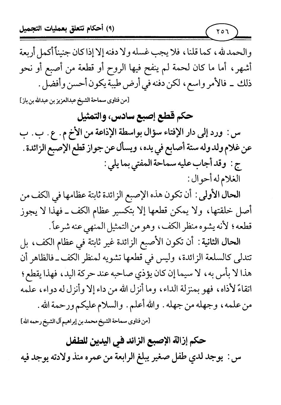 الحال الثانية: أن تكون الأصبع الزائدة غير ثابتة في عظام الكف بل تتدلى كالسلعة الزائدة، وليس في قطعها تشويه لمنظر الكف - فالظاهر أن هذا لا بأس به، لا سيما إن كان يؤذي صاحبه عند حركة اليد، فهذا يقطع: اتقاء لأذاه، فهو بمنزلة الداء، وما أنزل الله من داء إلا وأنزل له دواء، علمه من علمه، وجهله من جهله. والله أعلم. والسلام عليكم ورحمة الله.