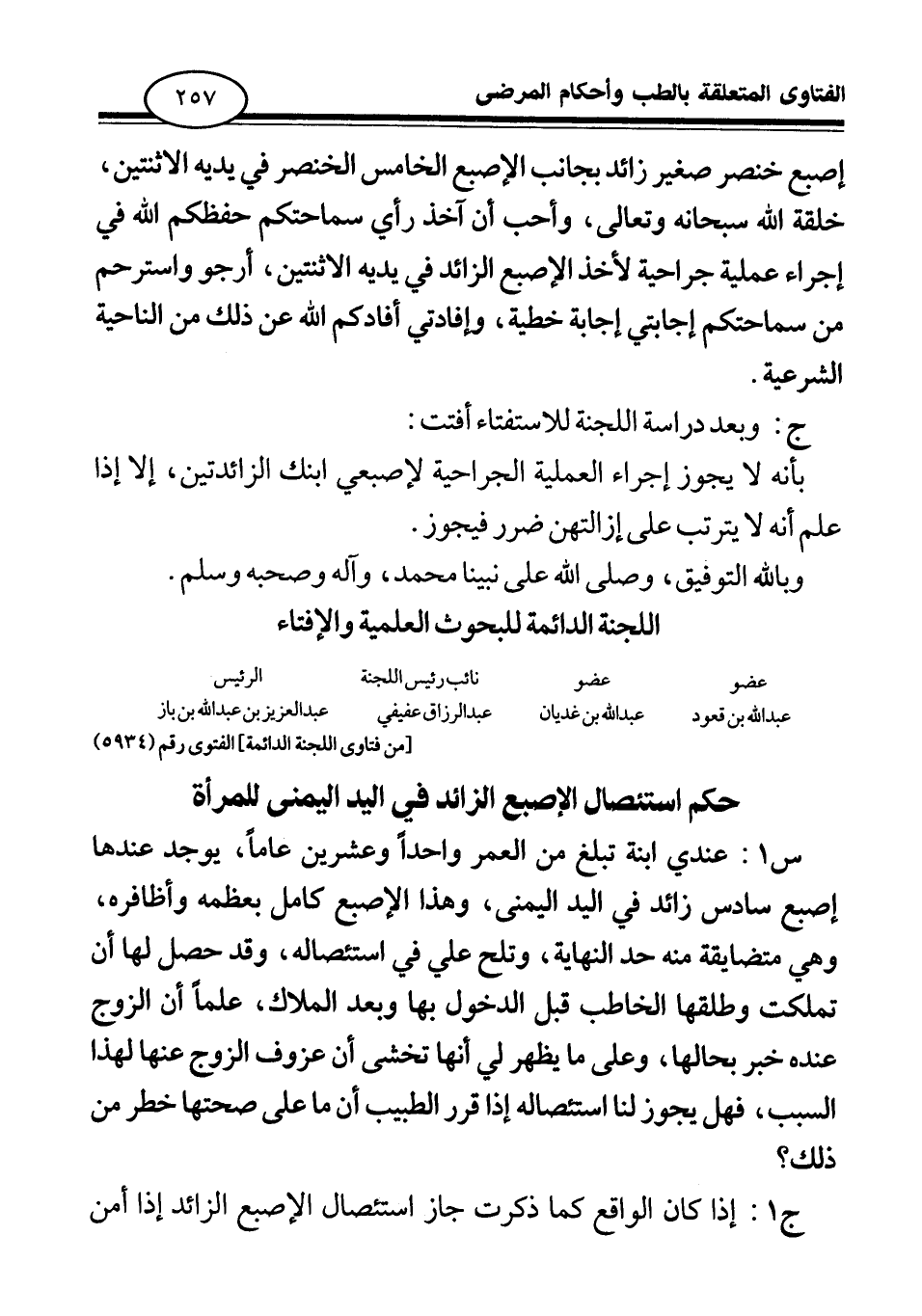 س 1: عندي ابنة تبلغ من العمر واحدا وعشرين عاما، يوجد عندها إصبع سادس زائد في اليد اليمنى، وهذا الإصبع كامل بعظمه وأظافره، وهي متضايقة منه حد النهاية، وتلح علي في استئصاله، وقد حصل لها أن تملكت وطلقها الخاطب قبل الدخول بها وبعد الملاك، علما أن الزوج عنده خبر بحالها، وعلى ما يظهر لي أنها تخشى أن عزوف الزوج عنها لهذا السبب، فهل يجوز لنا استئصاله إذا قرر الطبيب أن ما على صحتها خطر من ذلك؟
