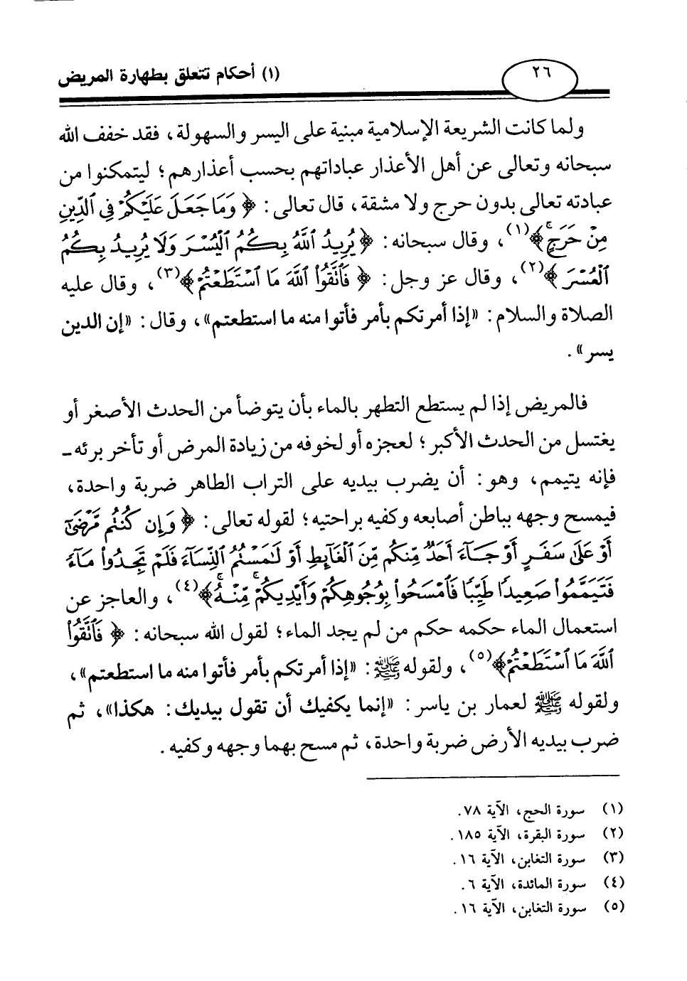 فالمريض إذا لم يستطع التطهر بالماء بأن يتوضأ من الحدث الأصغر أو يغتسل من الحدث الأكبر لعجزه أو لخوفه من زيادة المرض أو تأخر برئه، فإنه يتيمم، وهو أن يضرب بيديه على التراب الطاهر ضربة واحدة، فيمسح وجهه بباطن أصابعه وكفيه براحتيه؛ لقوله تعالى: {وَإِنْ كُنْتُمْ مَرْضَى أَوْ عَلَى سَفَرٍ أَوْ جَاءَ أَحَدٌ مِنْكُمْ مِنَ الْغَائِطِ أَوْ لَامَسْتُمُ النِّسَاءَ فَلَمْ تَجِدُوا مَاءً فَتَيَمَّمُوا صَعِيدًا طَيِّبًا فَامْسَحُوا بِوُجُوهِكُمْ وَأَيْدِيكُمْ منه} (¬6) ، والعاجز عن استعمال الماء حكمه حكم من لم يجد الماء، لقول الله سبحانه: {فَاتَّقُوا اللَّهَ مَا اسْتَطَعْتُمْ} (¬7) ، ولقوله صلى الله عليه وسلم: «إذا أمرتكم بأمر فأتوا منه ما استطعتم (¬8) » ، ولقوله صلى الله عليه وسلم لعمار بن ياسر: «إنما يكفيك أن تقول بيديك: هكذا (¬9) » ، ثم ضرب بيديه الأرض ضربة واحدة، ثم مسح بهما وجهه وكفيه.