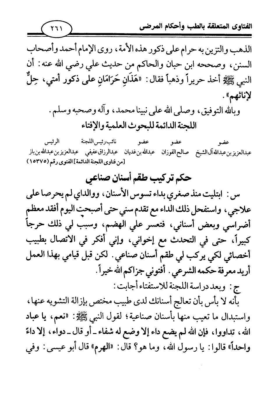 بأنه لا بأس بأن تعالج أسنانك لدى طبيب مختص بإزالة التشويه عنها، واستبدال ما تعيب منها بأسنان صناعية، لقول النبي صلى الله عليه وسلم: «نعم، يا عباد الله تداووا، فإن الله لم يضع داء إلا وضع له شفاء. أو قال: دواء إلا داء واحدا. قالوا: يا رسول الله، وما هو؟ قال: الهرم (¬1) » . قال أبو عيسى: وفي