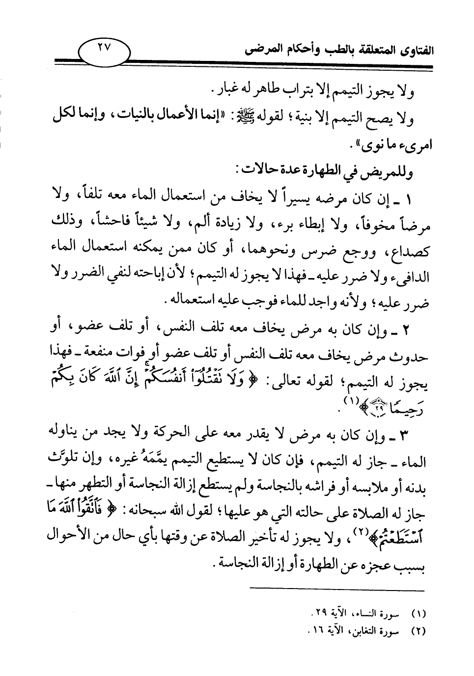 3 - وإن كان به مرض لا يقدر معه على الحركة ولا يجد من يناوله الماء جاز له التيمم. فإن كان لا يستطيع التيمم يممه غيره، وإن تلوث بدنه أو ملابسه أو فراشه بالنجاسة ولم يستطع إزالة النجاسة أو التطهر منها – جاز له الصلاة على حالته التي هو عليها؛ لقول الله سبحانه {فَاتَّقُوا اللَّهَ مَا اسْتَطَعْتُمْ} (¬3) ، ولا يجوز له تأخير الصلاة عن وقتها بأي حال من الأحوال بسب عجزه عن الطهارة أو إزالة النجاسة.