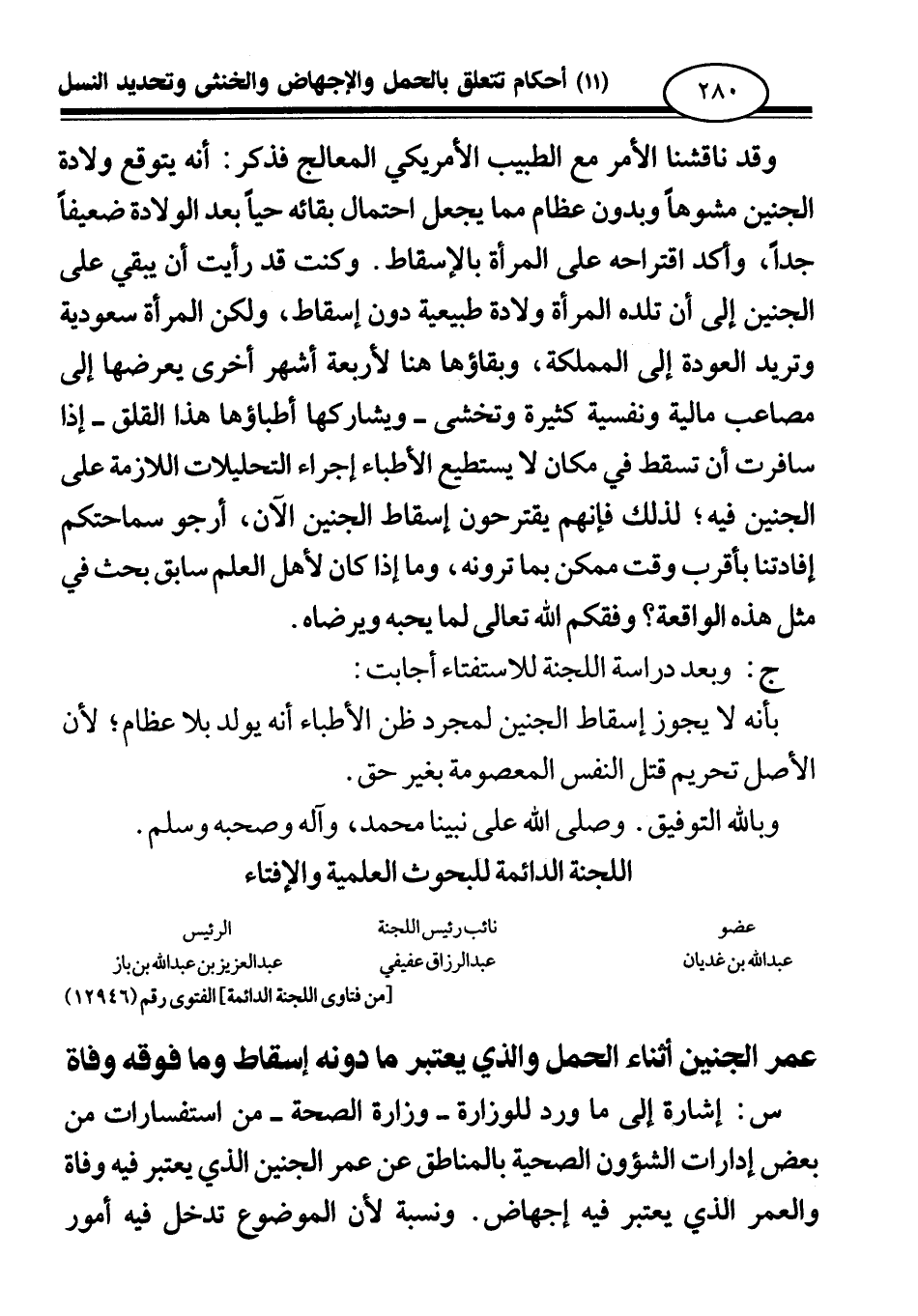 وقد ناقشنا الأمر مع الطبيب الأمريكي المعالج، فذكر: أنه يتوقع ولادة الجنين مشوها وبدون عظام، مما يجعل احتمال بقائه حيا بعد الولادة ضعيفا جدا، وأكد اقتراحه على المرأة بالإسقاط، وكنت قد رأيت أن يبقي على الجنين إلى أن تلده المرأة ولادة طبيعية دون إسقاط، ولكن المرأة سعودية، وتريد العودة إلى المملكة، وبقاؤها هنا لأربعة أشهر أخرى يعرضها إلى مصاعب مالية ونفسية كثيرة، وتخشى - ويشاركها أطباؤها هذا القلق - إذا سافرت أن تسقط في مكان لا يستطيع الأطباء إجراء التحليلات اللازمة على الجنين فيه؛ لذلك فإنهم يقترحون إسقاط الجنين الآن. أرجو سماحتكم إفادتنا بأقرب وقت ممكن بما ترونه، وما إذا كان لأهل العلم سابق بحث في مثل هذه الواقعة، وفقكم الله تعالى لما يحبه ويرضاه.