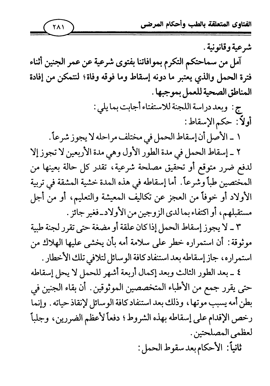 4 - بعد الطور الثالث، وبعد إكمال أربعة أشهر للحمل لا يحل إسقاطه حتى يقرر جمع من الأطباء المتخصصين الموثوقين أن بقاء الجنين في بطن أمه يسبب موتها، وذلك بعد استنفاد كافة الوسائل لإنقاذ حياته، وإنما رخص الإقدام على إسقاطه بهذه الشروط دفعا لأعظم الضررين وجلبا لعظمى المصلحتين.