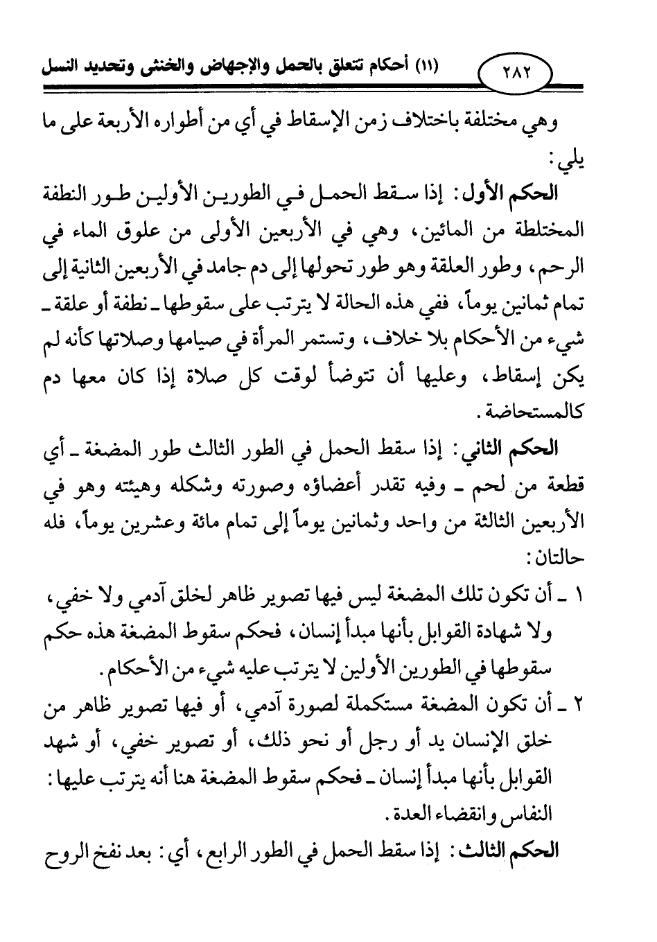 الحكم الثاني: إذا سقط الحمل في الطور الثالث، طور المضغة، - أي: قطعة من لحم - وفيه تقدر أعضاؤه وصورته وشكله وهيئته وهو في الأربعين الثالثة من واحد وثمانين يوما إلى تمام مائة وعشرين يوما، فله حالتان: