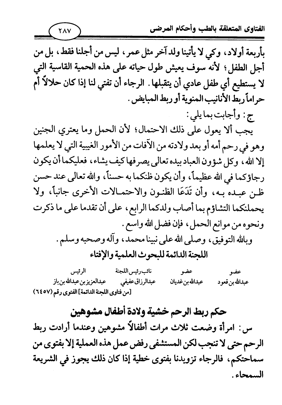 س: امرأة وضعت ثلاث مرات أطفالا مشوهين وعندما أرادت ربط الرحم حتى لا تنجب ولكن المستشفى رفض عمل هذه العملية إلا بفتوى من سماحتكم، فالرجاء تزويدنا خطية إذا كان ذلك يجوز في الشريعة السمحاء.