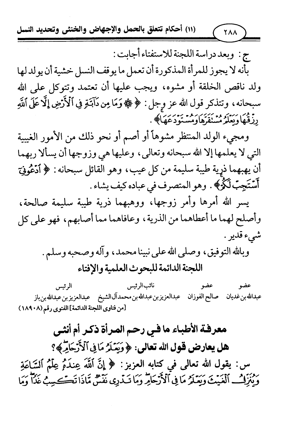 بأنه لا يجوز للمرأة المذكورة أن تعمل ما يوقف النسل خشية أن يولد لها ولد ناقص الخلقة أو مشوه، ويجب عليها أن تعتمد وتتوكل على الله سبحانه وتتذكر قول الله عز وجل: {وَمَا مِنْ دَابَّةٍ فِي الْأَرْضِ إِلَّا عَلَى اللَّهِ رِزْقُهَا وَيَعْلَمُ مُسْتَقَرَّهَا وَمُسْتَوْدَعَهَا} (¬1) ، ومجيء الولد المنتظر مشوها أو أصم أو نحو ذلك من الأمور الغيبية التي لا يعلمها إلا الله سبحانه وتعالى، وعليها هي وزوجها أن يسألا ربهما أن يهبهما ذرية طيبة سليمة من كل عيب، وهو القائل سبحانه: {ادْعُونِي أَسْتَجِبْ لَكُمْ} (¬2) . وهو المتصرف في عباده كيف يشاء.